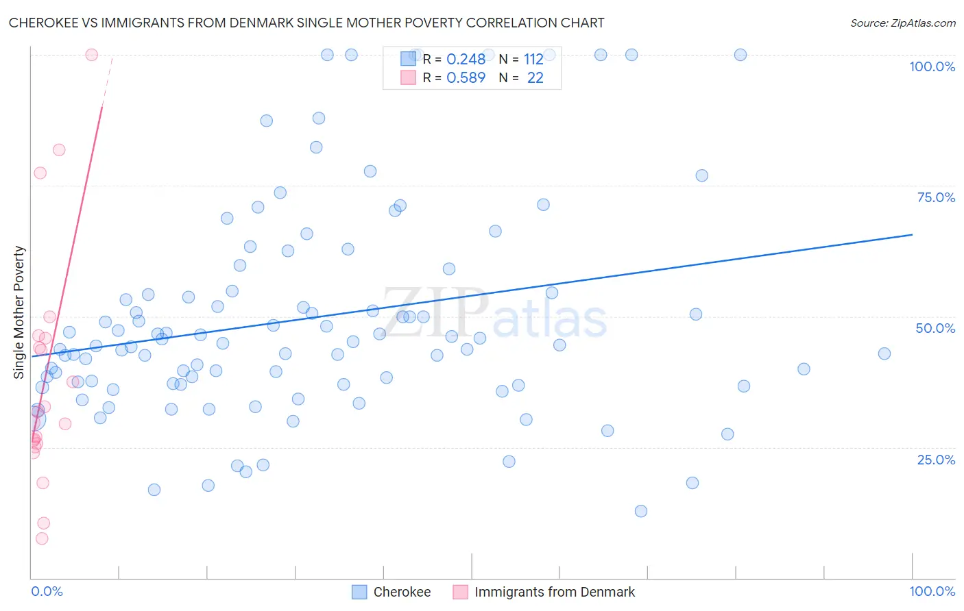 Cherokee vs Immigrants from Denmark Single Mother Poverty Correlation Chart