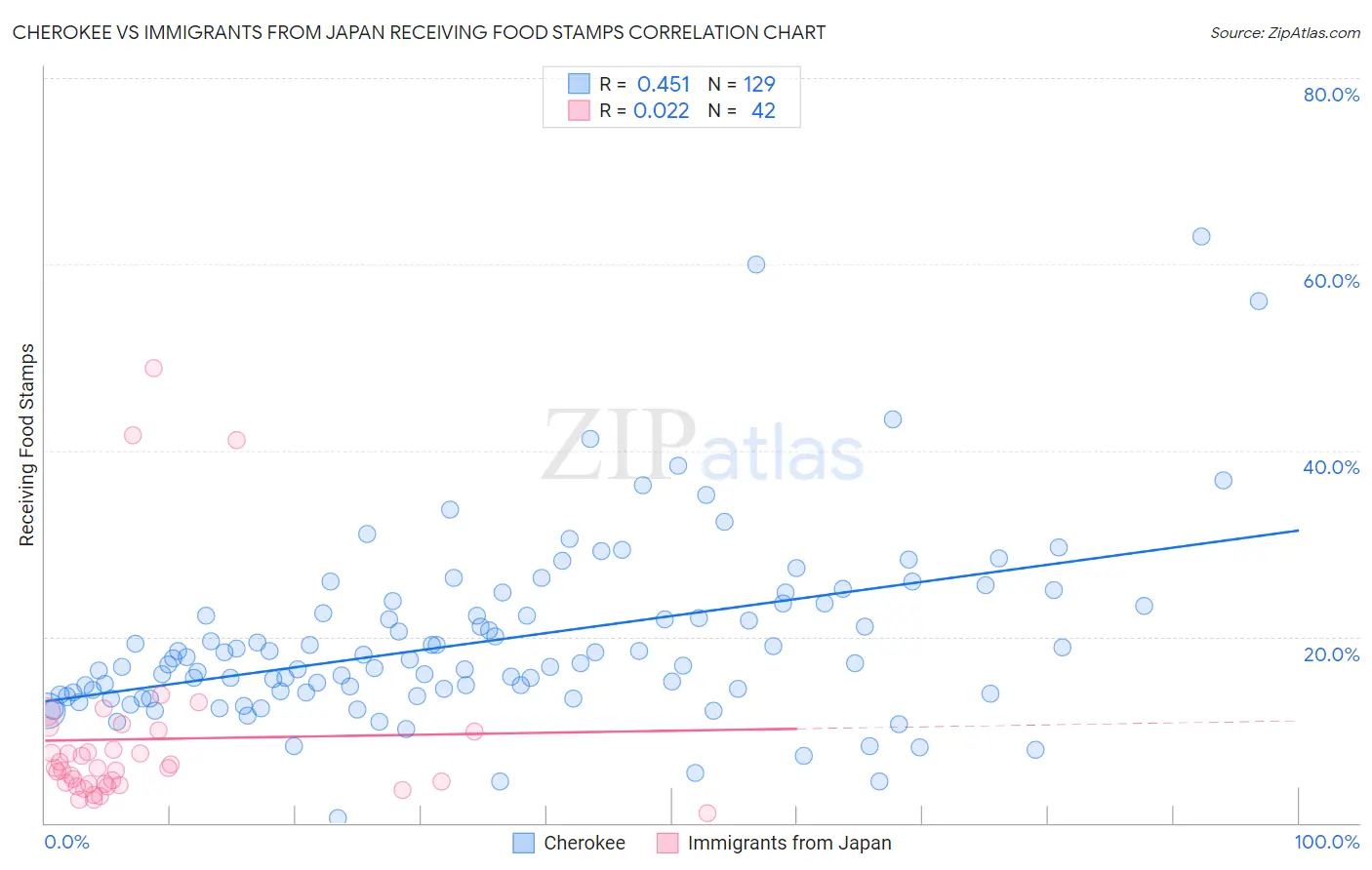 Cherokee vs Immigrants from Japan Receiving Food Stamps Correlation Chart