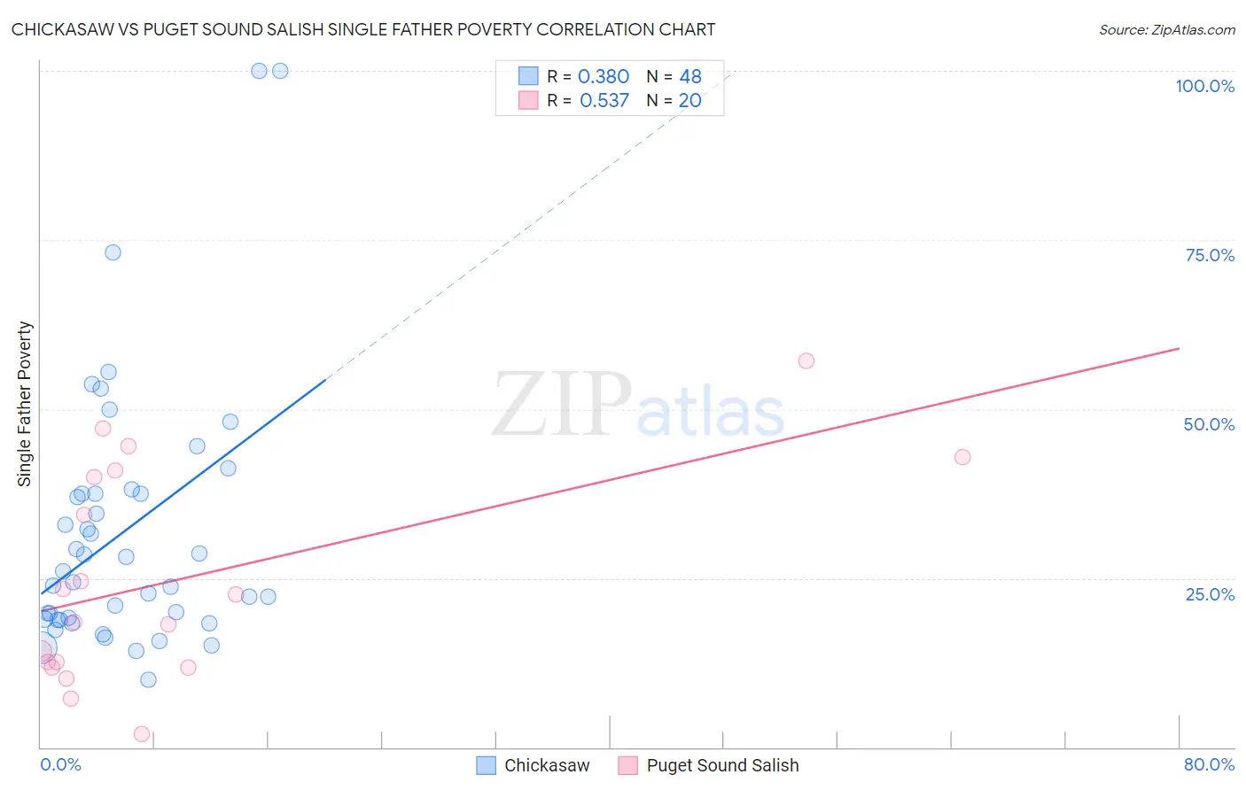 Chickasaw vs Puget Sound Salish Single Father Poverty Correlation Chart