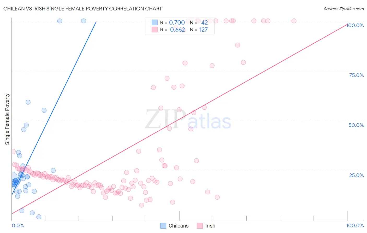 Chilean vs Irish Single Female Poverty Correlation Chart