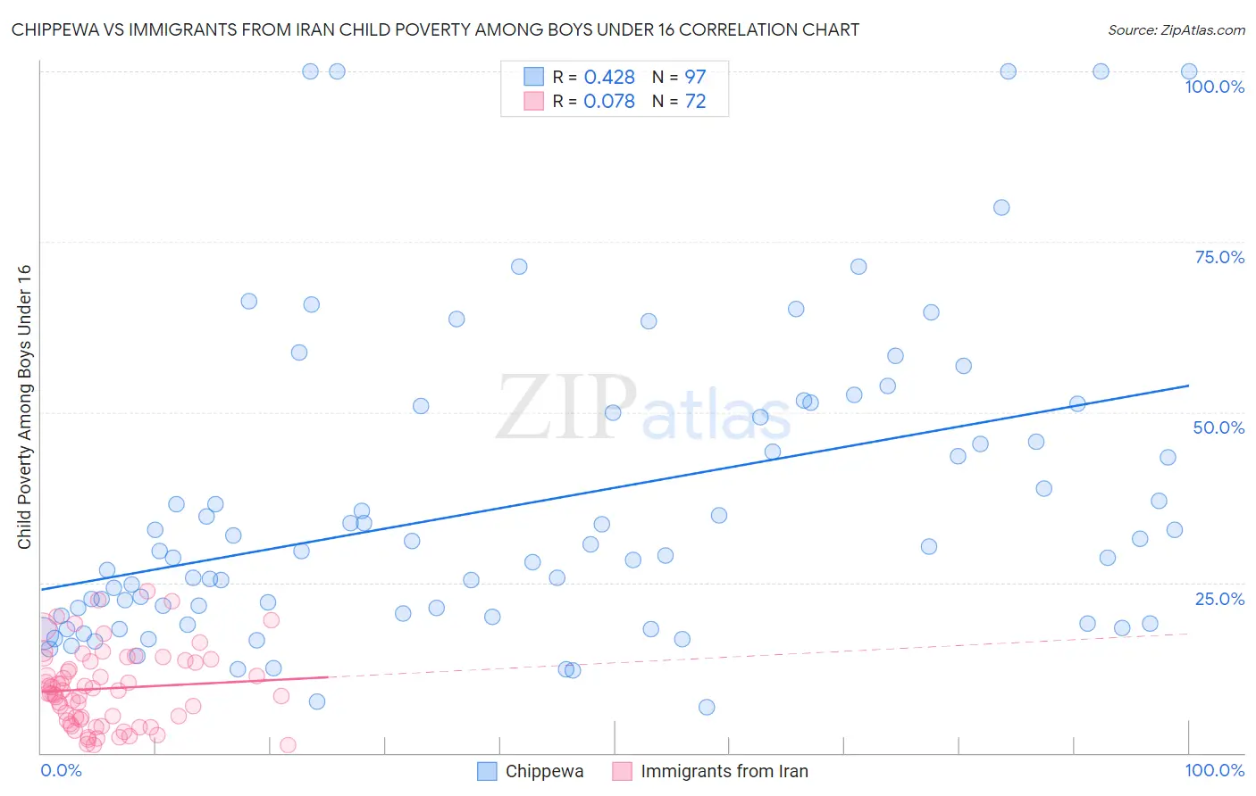 Chippewa vs Immigrants from Iran Child Poverty Among Boys Under 16 Correlation Chart