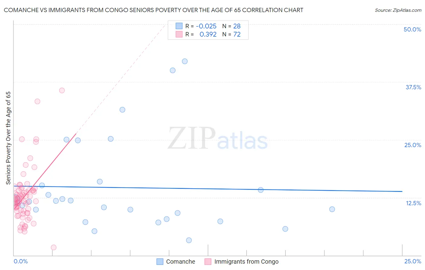 Comanche vs Immigrants from Congo Seniors Poverty Over the Age of 65 Correlation Chart