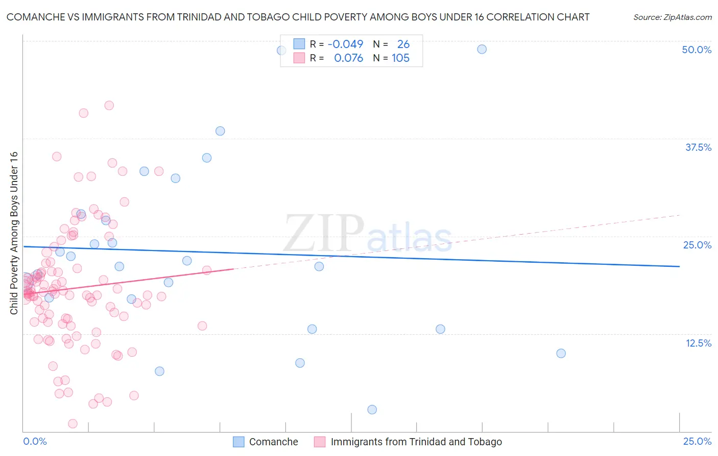 Comanche vs Immigrants from Trinidad and Tobago Child Poverty Among Boys Under 16 Correlation Chart