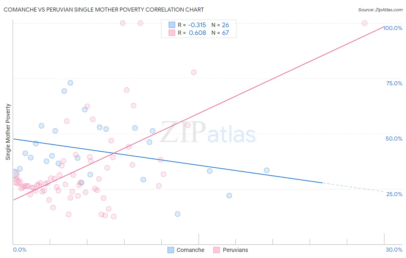 Comanche vs Peruvian Single Mother Poverty Correlation Chart