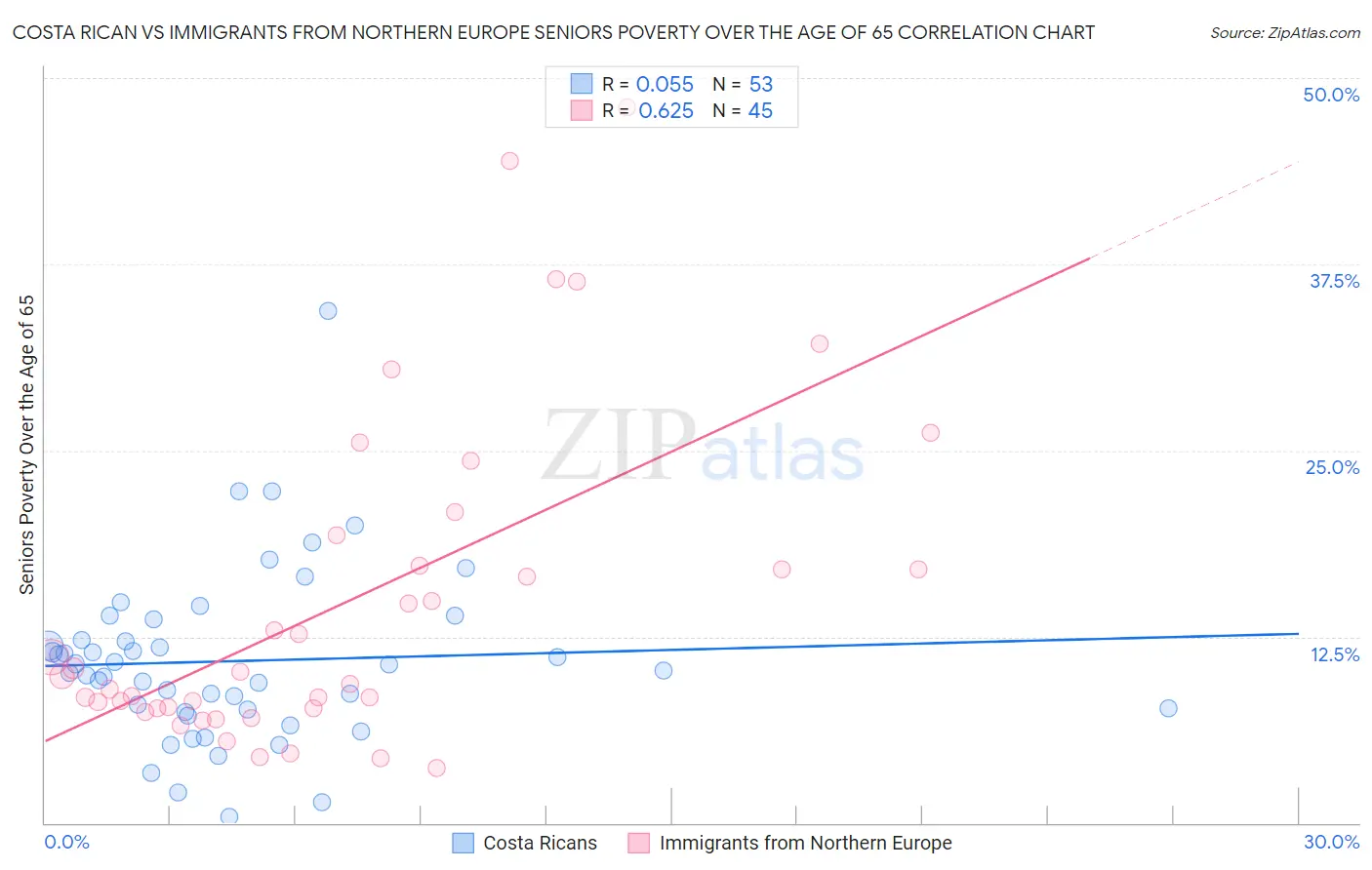 Costa Rican vs Immigrants from Northern Europe Seniors Poverty Over the Age of 65 Correlation Chart