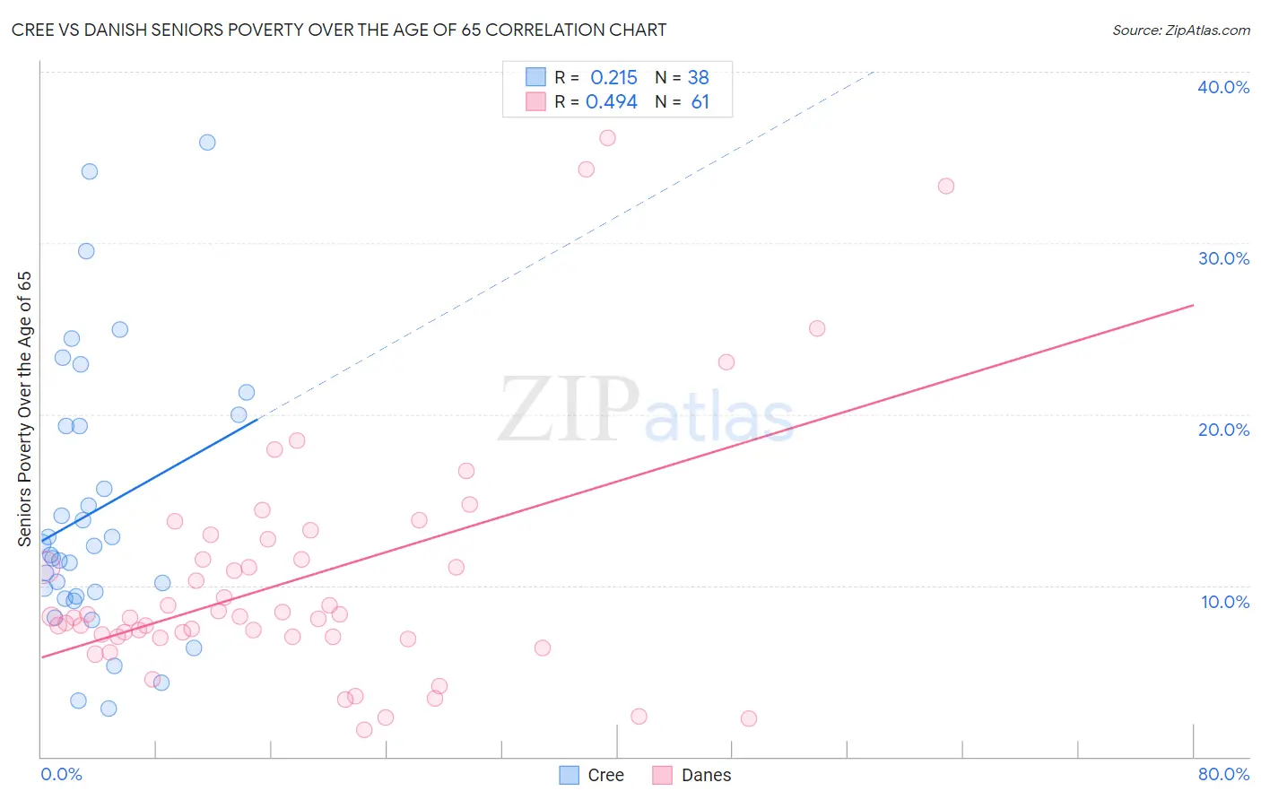 The statistical analysis conducted on geographies consisting of 76,178,735 people shows a weak positive correlation between the proportion of Cree and poverty level among seniors over the age of 65 in the United States with a correlation coefficient (R) of 0.215 and weighted average of 12.1%. Similarly, the statistical analysis conducted on geographies consisting of 471,575,123 people shows a moderate positive correlation between the proportion of Danes and poverty level among seniors over the age of 65 in the United States with a correlation coefficient (R) of 0.494 and weighted average of 8.8%, a difference of 37.9%.
