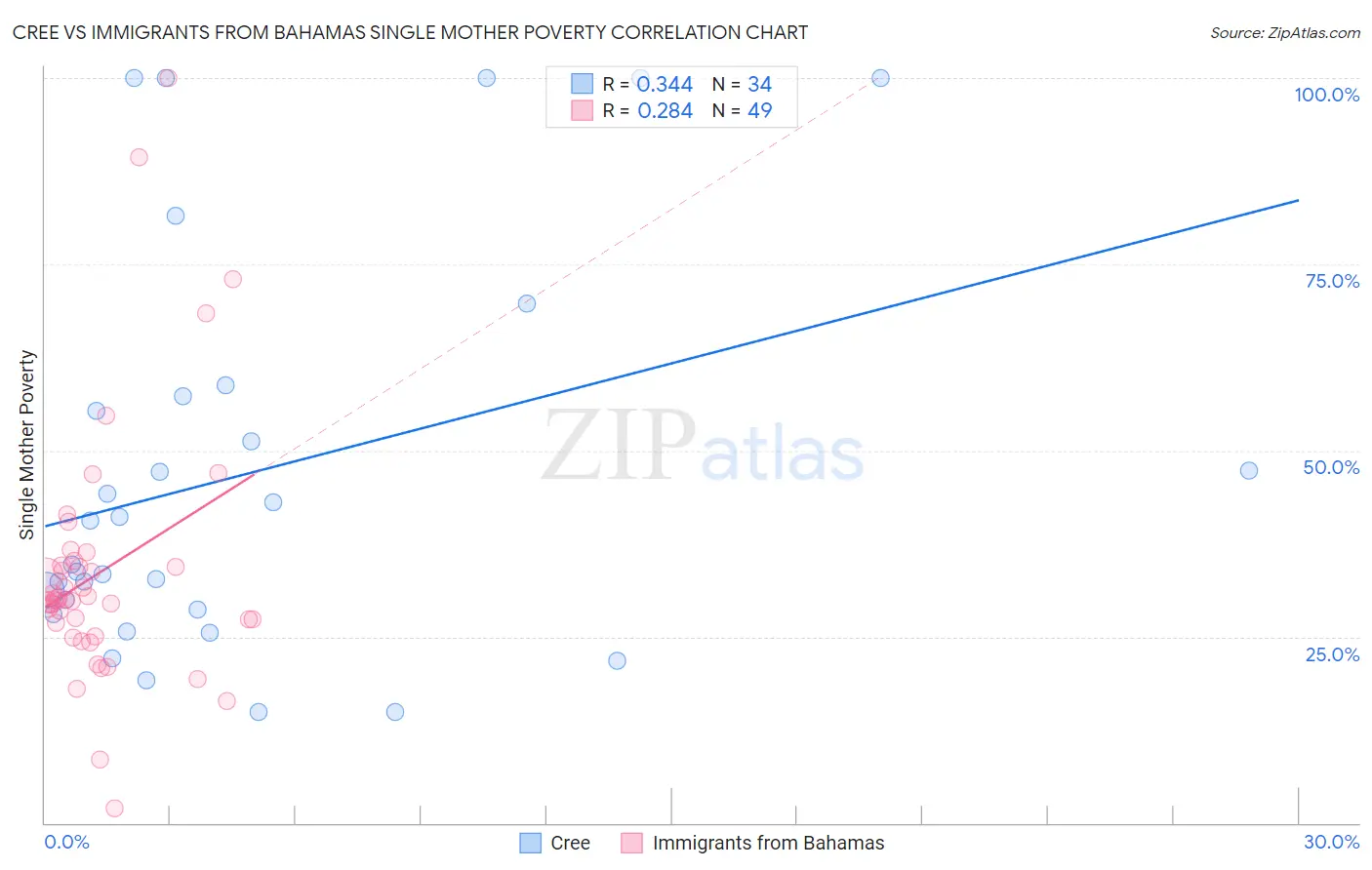 Cree vs Immigrants from Bahamas Single Mother Poverty Correlation Chart