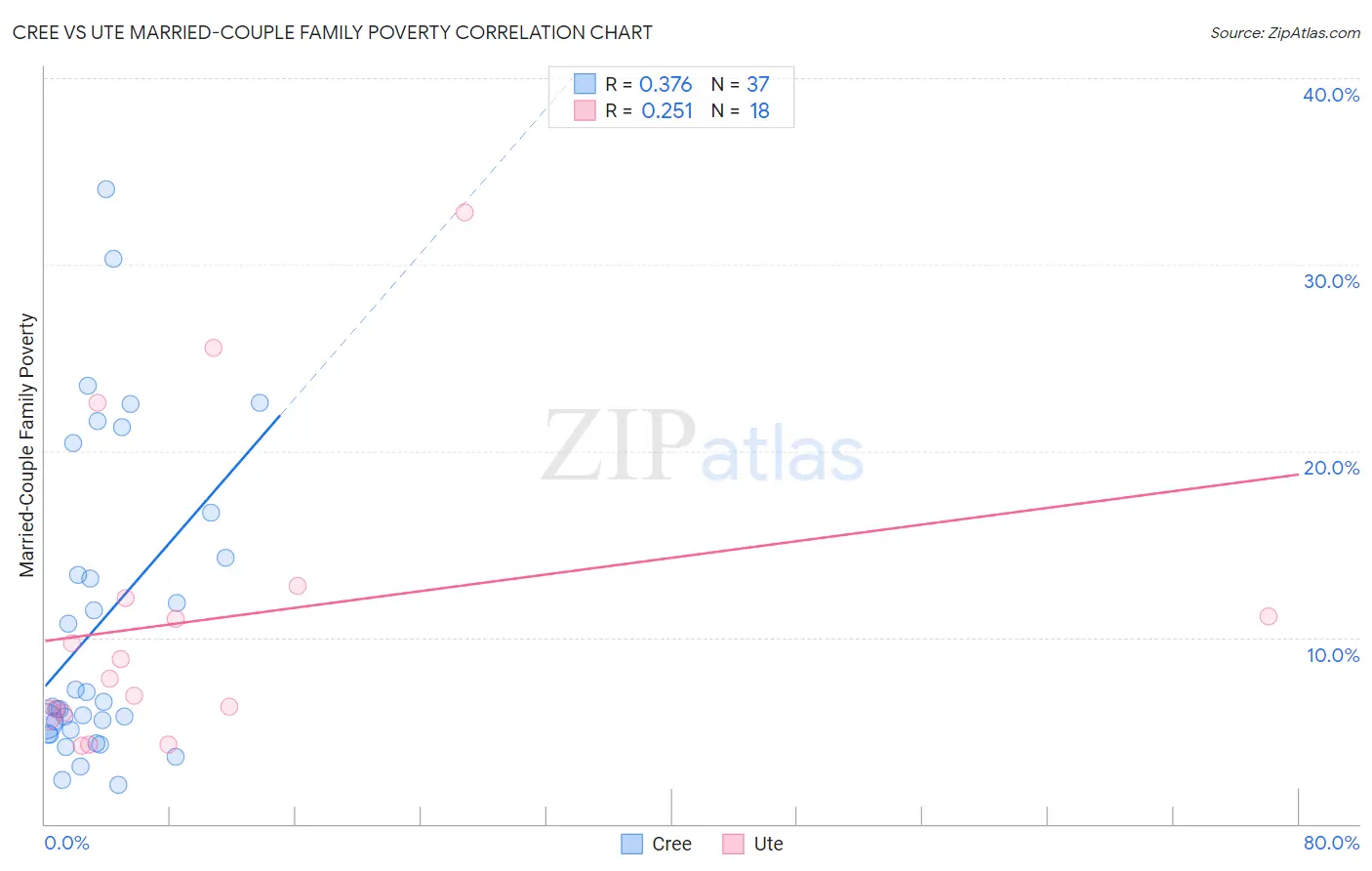 The statistical analysis conducted on geographies consisting of 76,066,052 people shows a mild positive correlation between the proportion of Cree and poverty level among married-couple families in the United States with a correlation coefficient (R) of 0.376 and weighted average of 5.9%. Similarly, the statistical analysis conducted on geographies consisting of 55,601,048 people shows a weak positive correlation between the proportion of Ute and poverty level among married-couple families in the United States with a correlation coefficient (R) of 0.251 and weighted average of 6.4%, a difference of 9.3%.