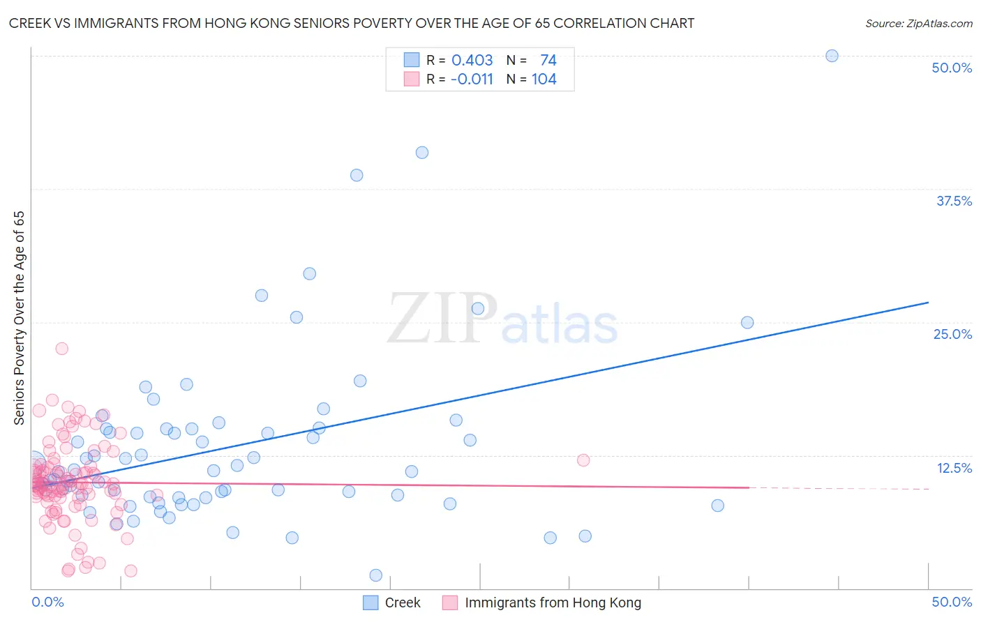 Creek vs Immigrants from Hong Kong Seniors Poverty Over the Age of 65 Correlation Chart