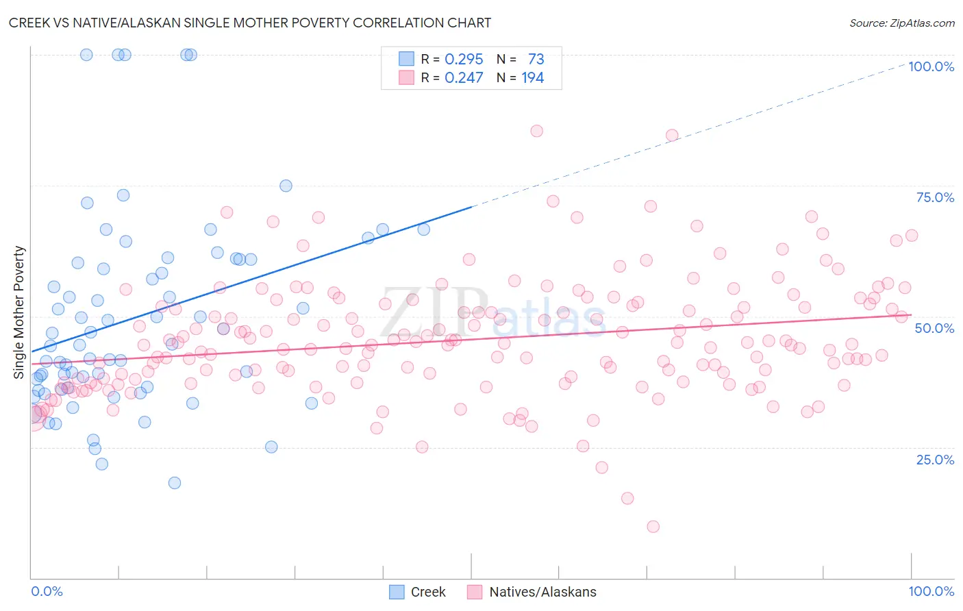 Creek vs Native/Alaskan Single Mother Poverty Correlation Chart