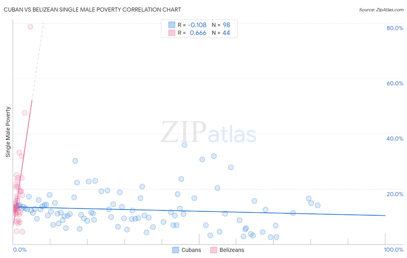 Cuban vs Belizean Single Male Poverty Correlation Chart