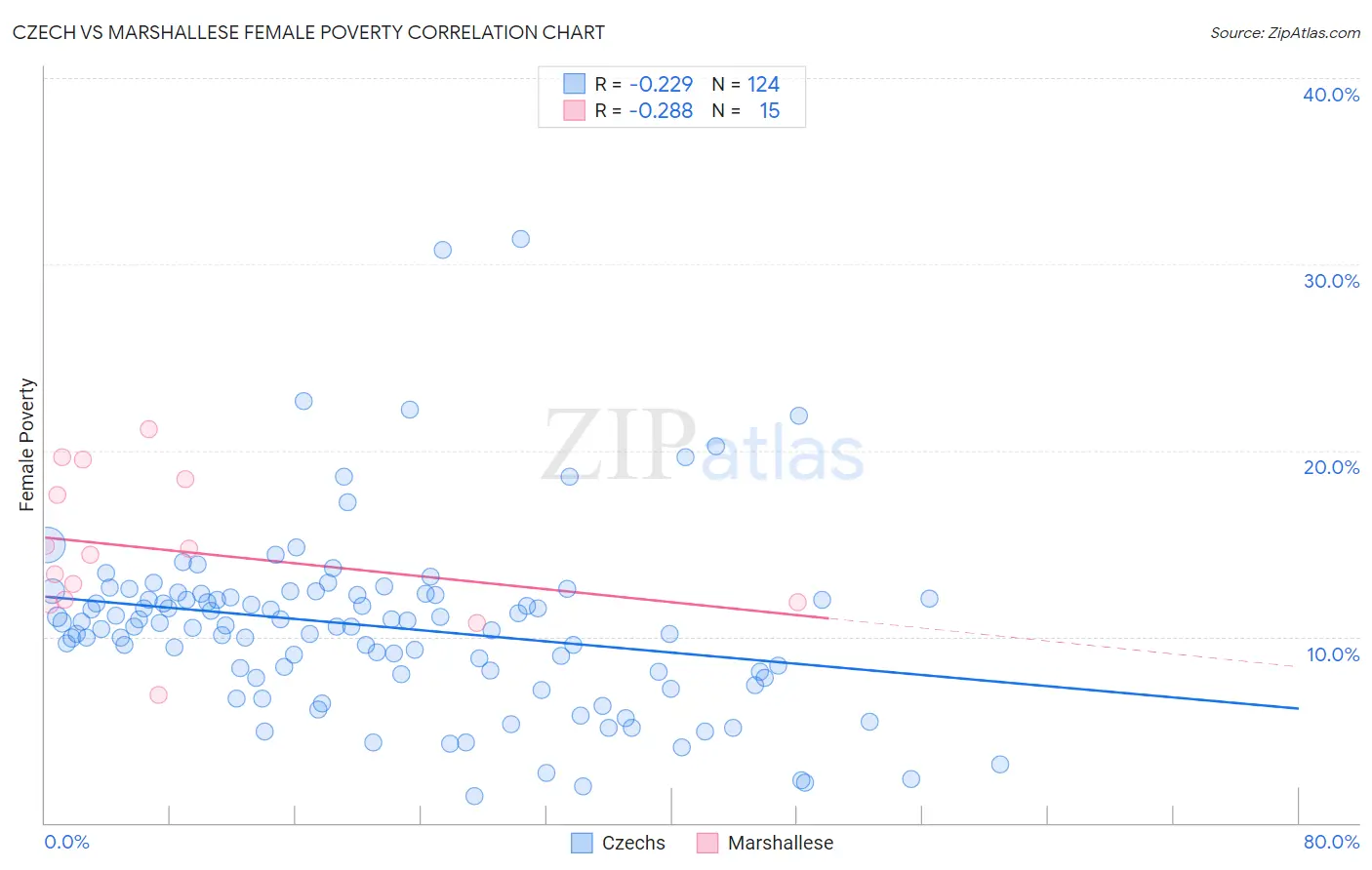 The statistical analysis conducted on geographies consisting of 484,224,691 people shows a weak negative correlation between the proportion of Czechs and poverty level among females in the United States with a correlation coefficient (R) of -0.229 and weighted average of 11.9%. Similarly, the statistical analysis conducted on geographies consisting of 14,760,991 people shows a weak negative correlation between the proportion of Marshallese and poverty level among females in the United States with a correlation coefficient (R) of -0.288 and weighted average of 14.4%, a difference of 21.2%.