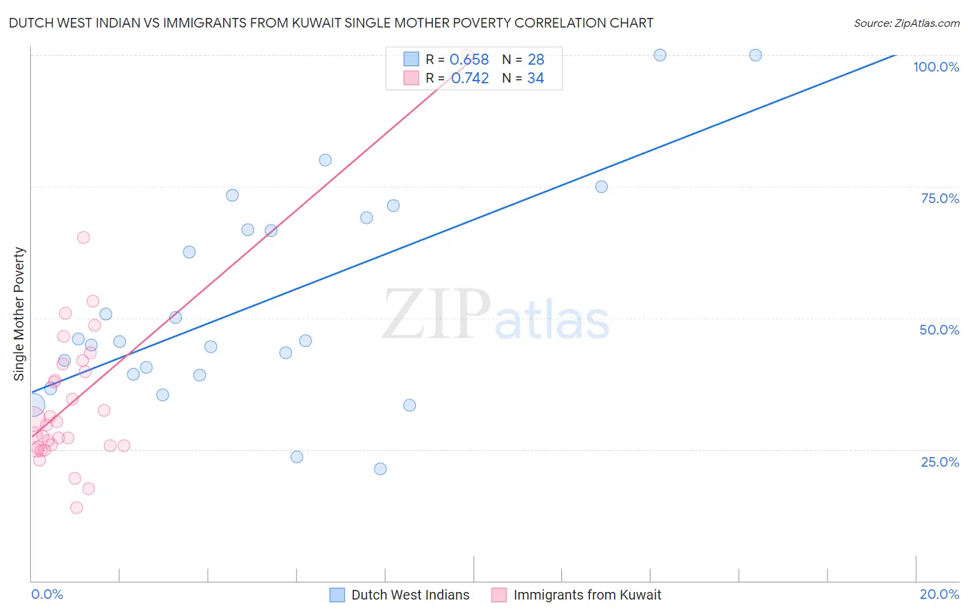 Dutch West Indian vs Immigrants from Kuwait Single Mother Poverty Correlation Chart