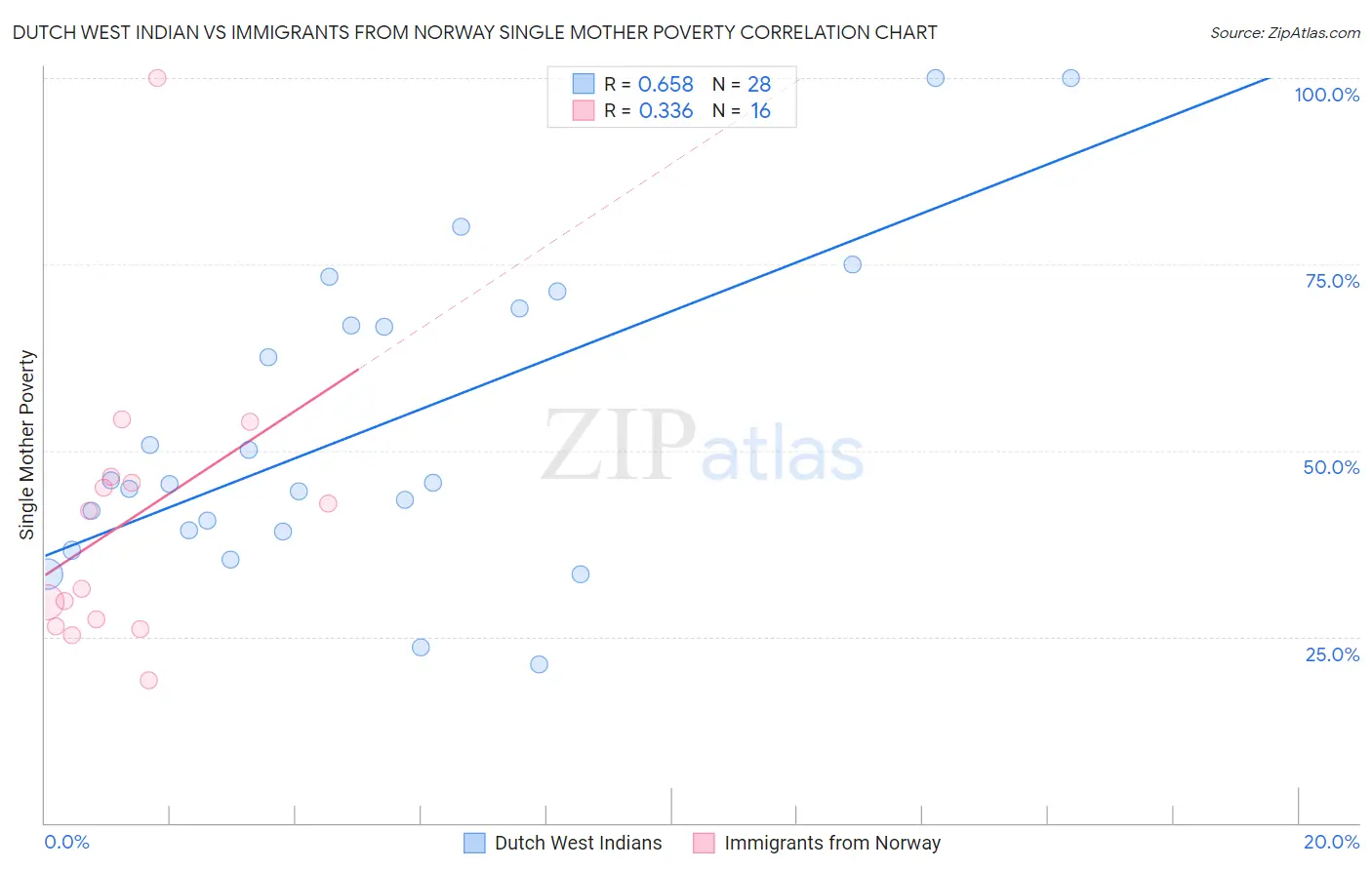 Dutch West Indian vs Immigrants from Norway Single Mother Poverty Correlation Chart