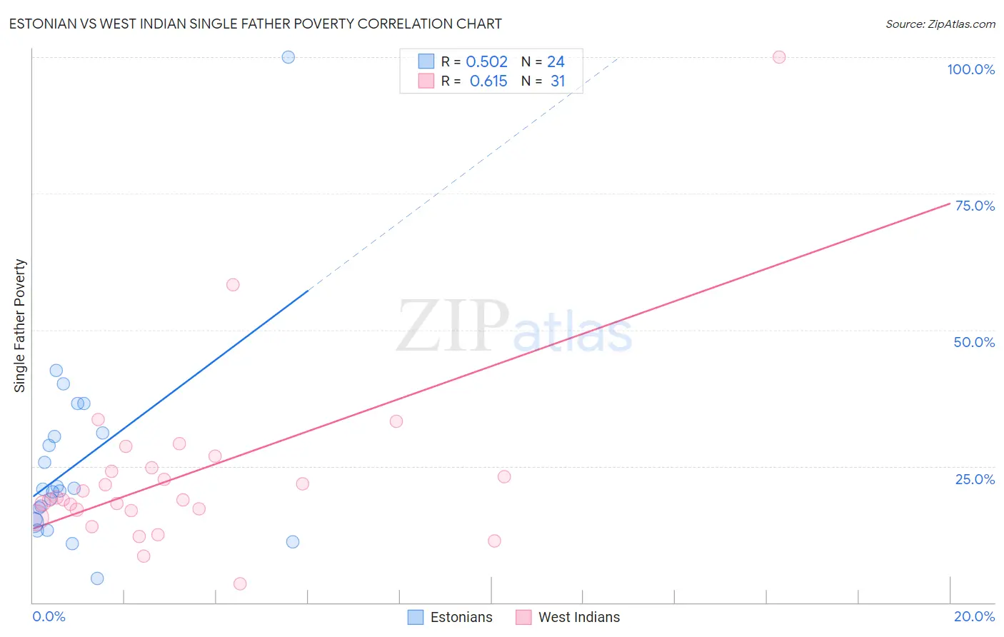 Estonian vs West Indian Single Father Poverty Correlation Chart
