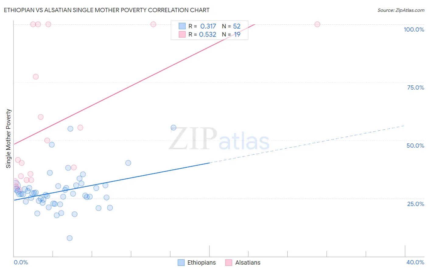 Ethiopian vs Alsatian Single Mother Poverty Correlation Chart