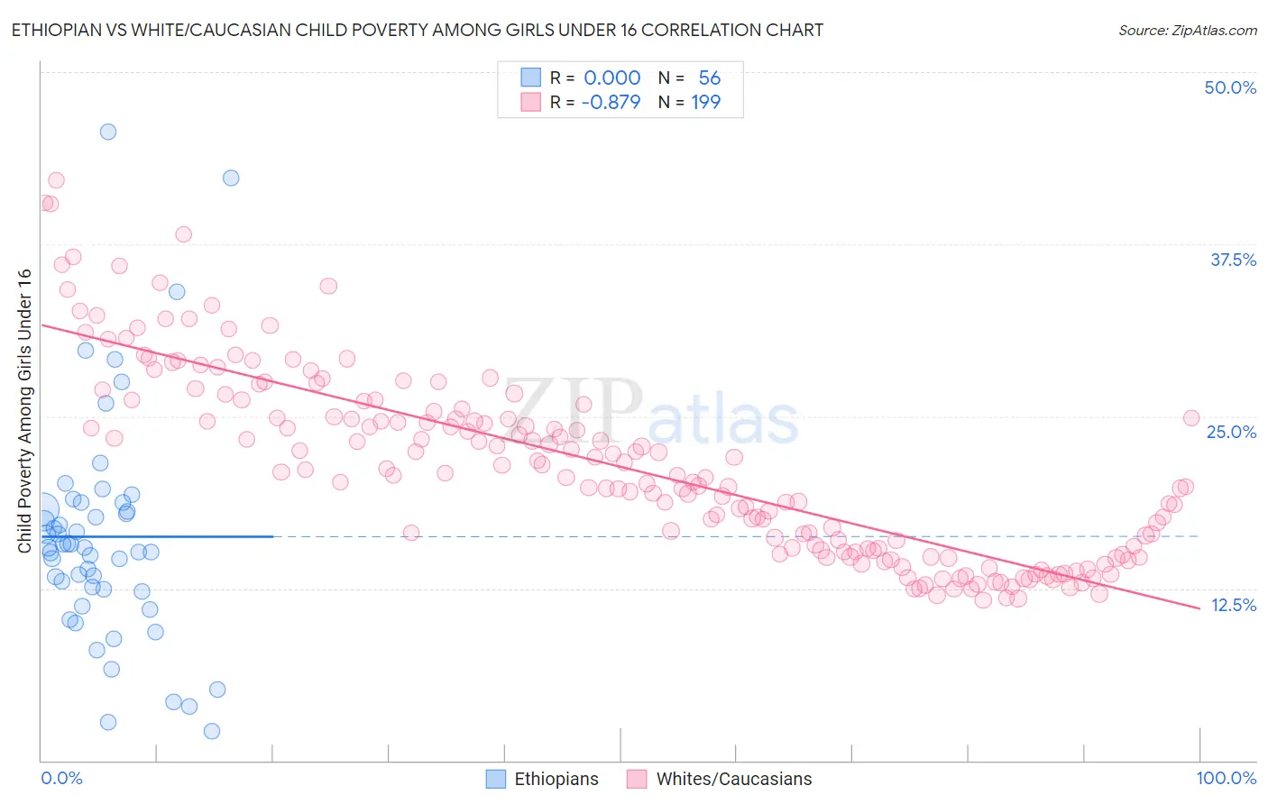 The statistical analysis conducted on geographies consisting of 221,230,982 people shows no correlation between the proportion of Ethiopians and poverty level among girls under the age of 16 in the United States with a correlation coefficient (R) of 0.000 and weighted average of 16.5%. Similarly, the statistical analysis conducted on geographies consisting of 558,680,954 people shows a very strong negative correlation between the proportion of Whites/Caucasians and poverty level among girls under the age of 16 in the United States with a correlation coefficient (R) of -0.879 and weighted average of 16.6%, a difference of 0.73%.