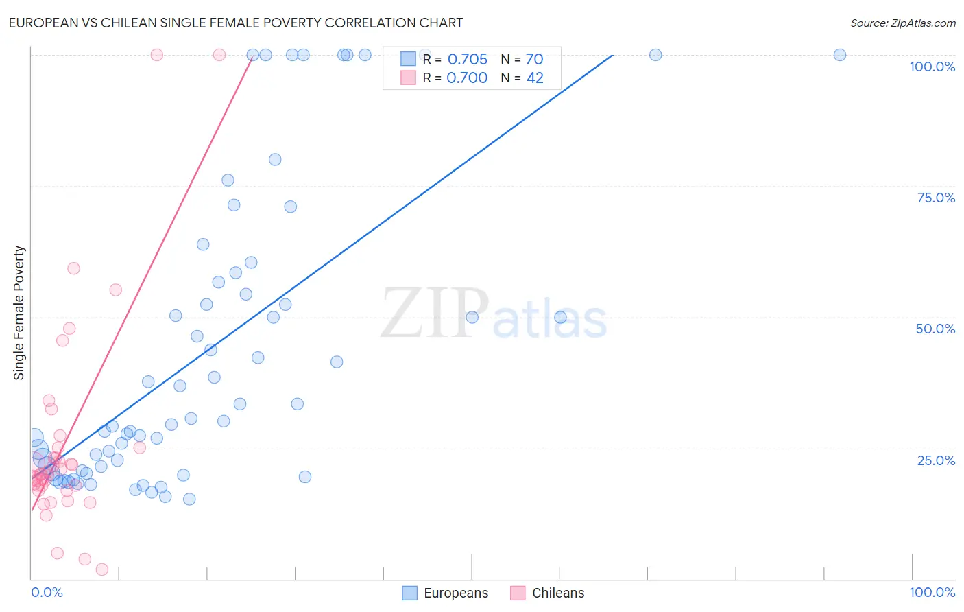 The statistical analysis conducted on geographies consisting of 543,036,354 people shows a strong positive correlation between the proportion of Europeans and poverty level among single females in the United States with a correlation coefficient (R) of 0.705 and weighted average of 21.1%. Similarly, the statistical analysis conducted on geographies consisting of 254,415,237 people shows a strong positive correlation between the proportion of Chileans and poverty level among single females in the United States with a correlation coefficient (R) of 0.700 and weighted average of 19.9%, a difference of 6.2%.