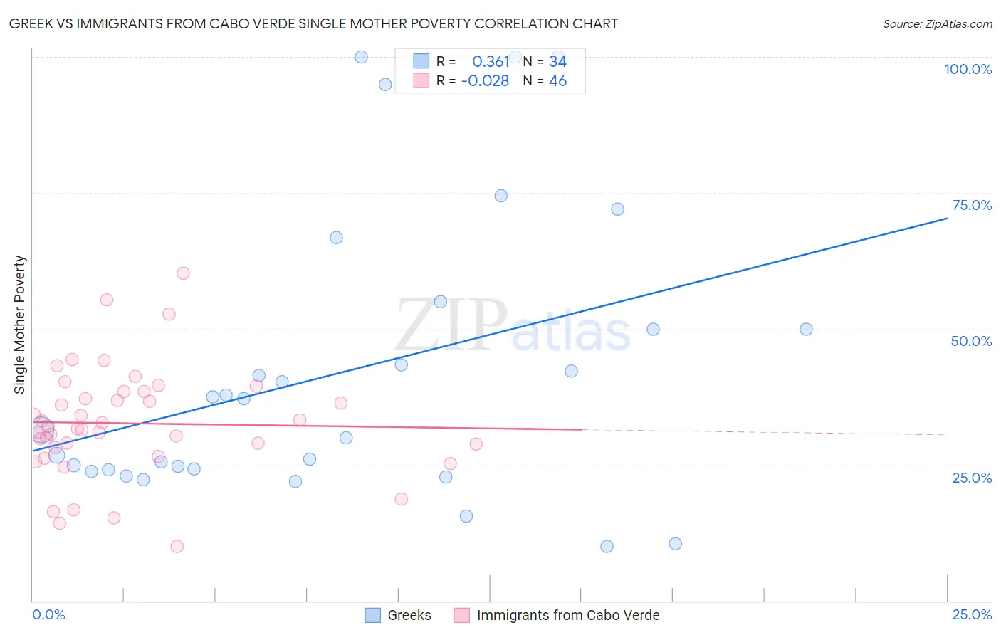 Greek vs Immigrants from Cabo Verde Single Mother Poverty Correlation Chart