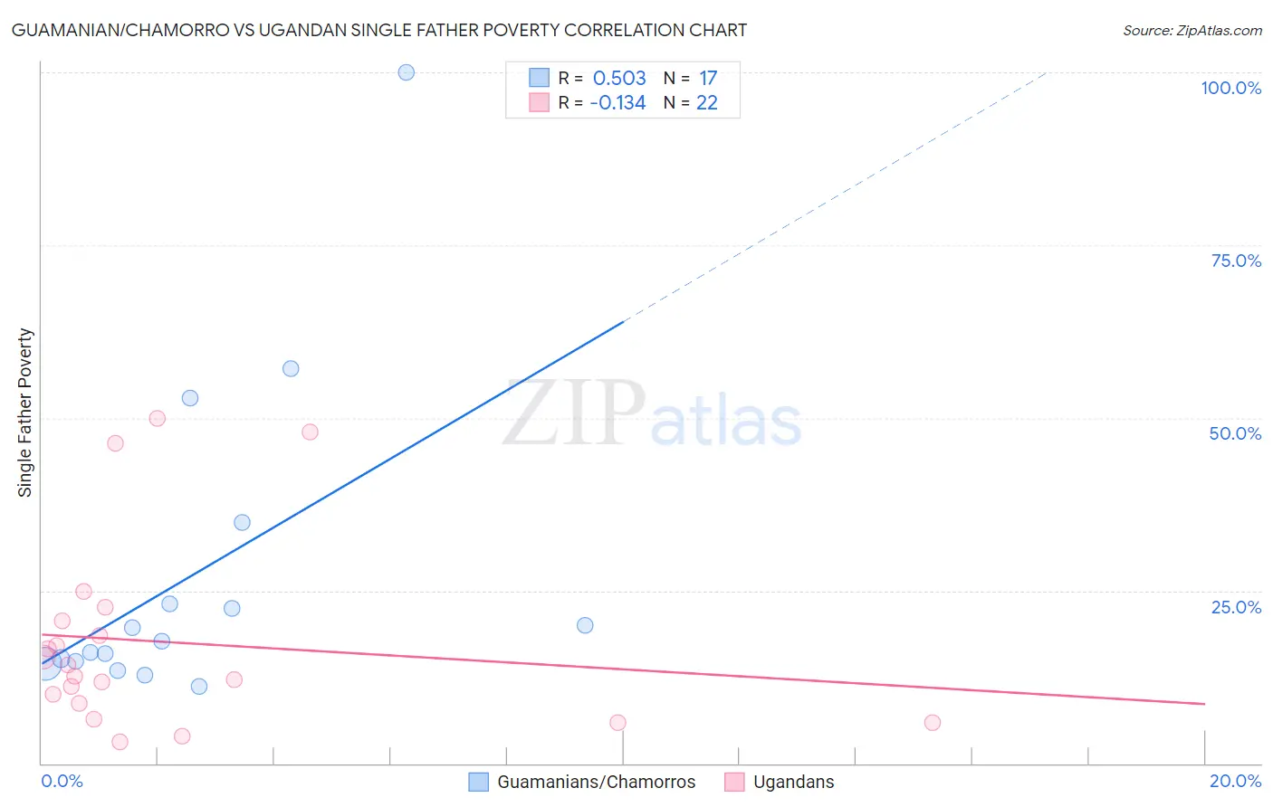Guamanian/Chamorro vs Ugandan Single Father Poverty Correlation Chart