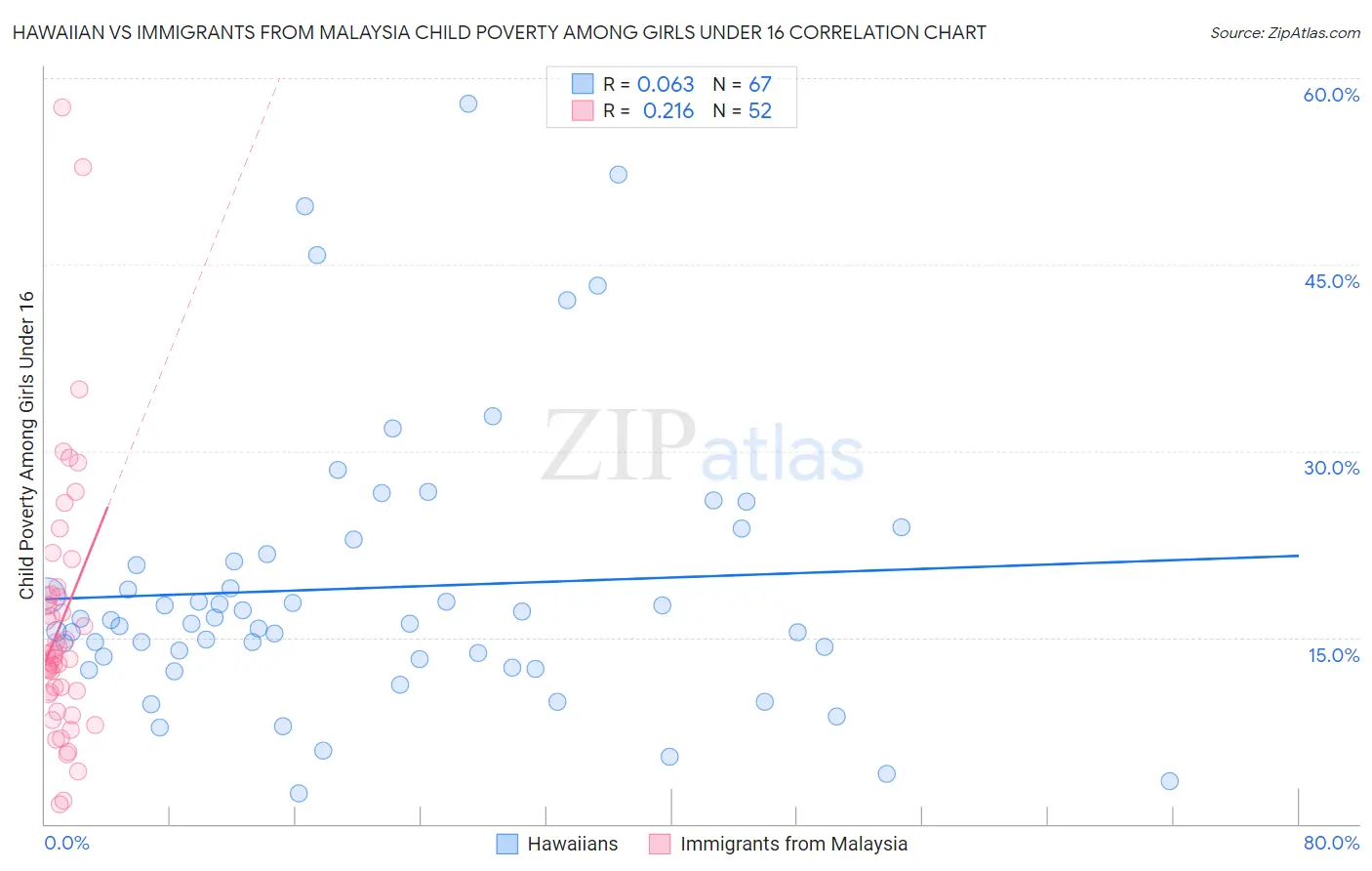 Hawaiian vs Immigrants from Malaysia Child Poverty Among Girls Under 16 Correlation Chart