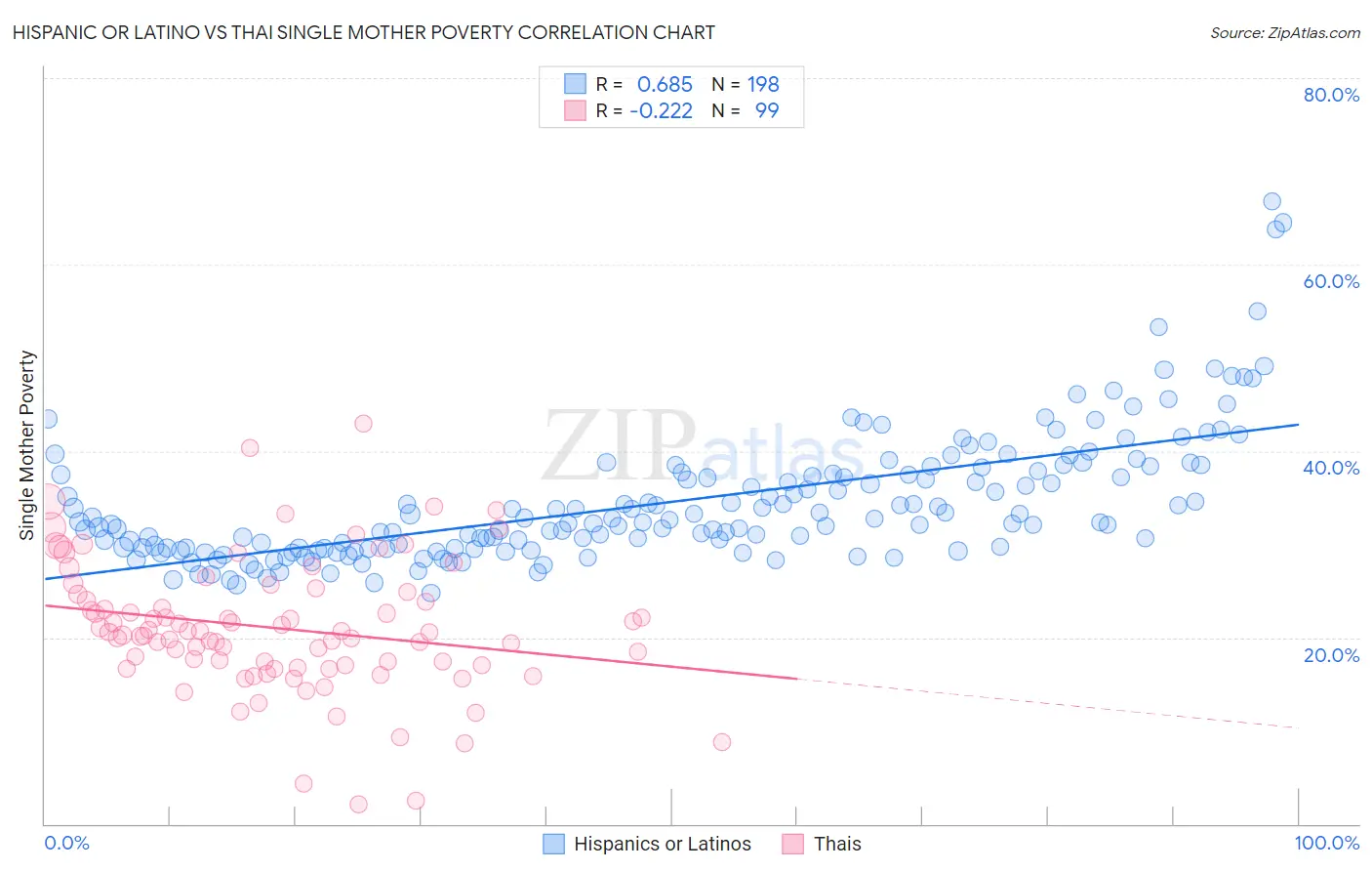 Hispanic or Latino vs Thai Single Mother Poverty Correlation Chart