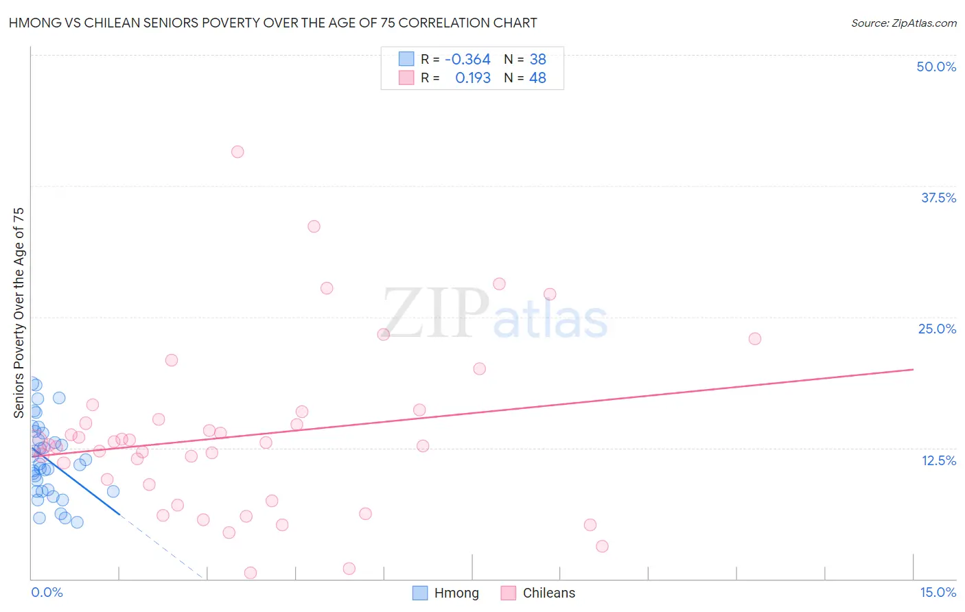 The statistical analysis conducted on geographies consisting of 24,651,884 people shows a mild negative correlation between the proportion of Hmong and poverty level among seniors over the age of 75 in the United States with a correlation coefficient (R) of -0.364 and weighted average of 12.0%. Similarly, the statistical analysis conducted on geographies consisting of 254,835,518 people shows a poor positive correlation between the proportion of Chileans and poverty level among seniors over the age of 75 in the United States with a correlation coefficient (R) of 0.193 and weighted average of 12.6%, a difference of 5.7%.