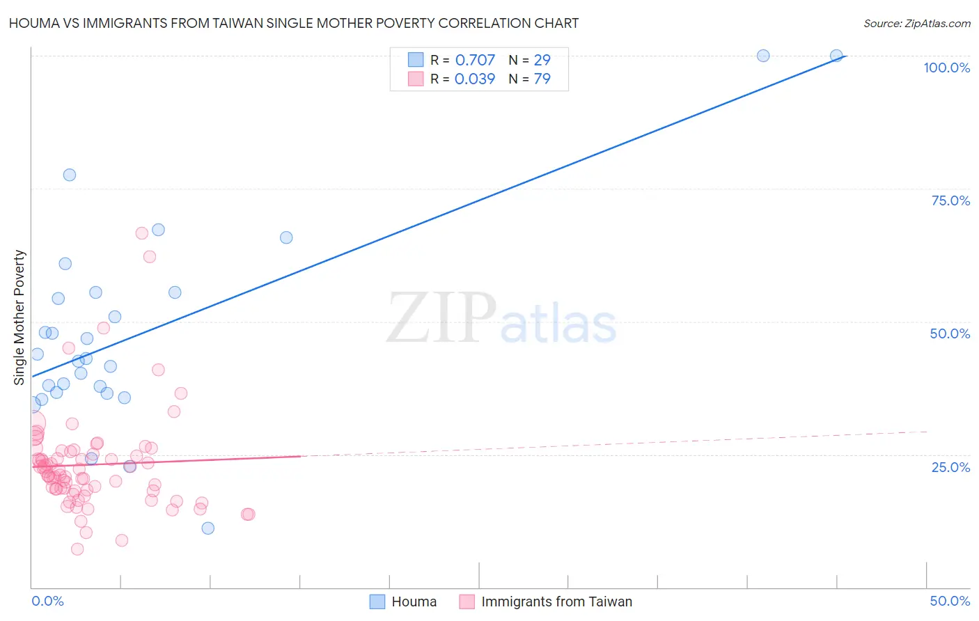 Houma vs Immigrants from Taiwan Single Mother Poverty Correlation Chart