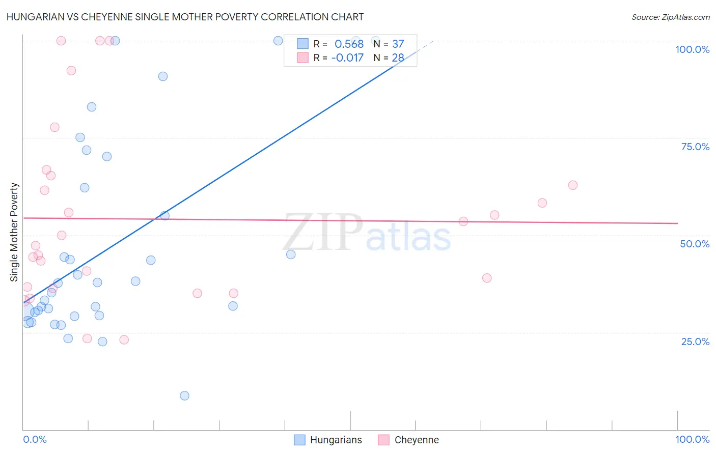 Hungarian vs Cheyenne Single Mother Poverty Correlation Chart