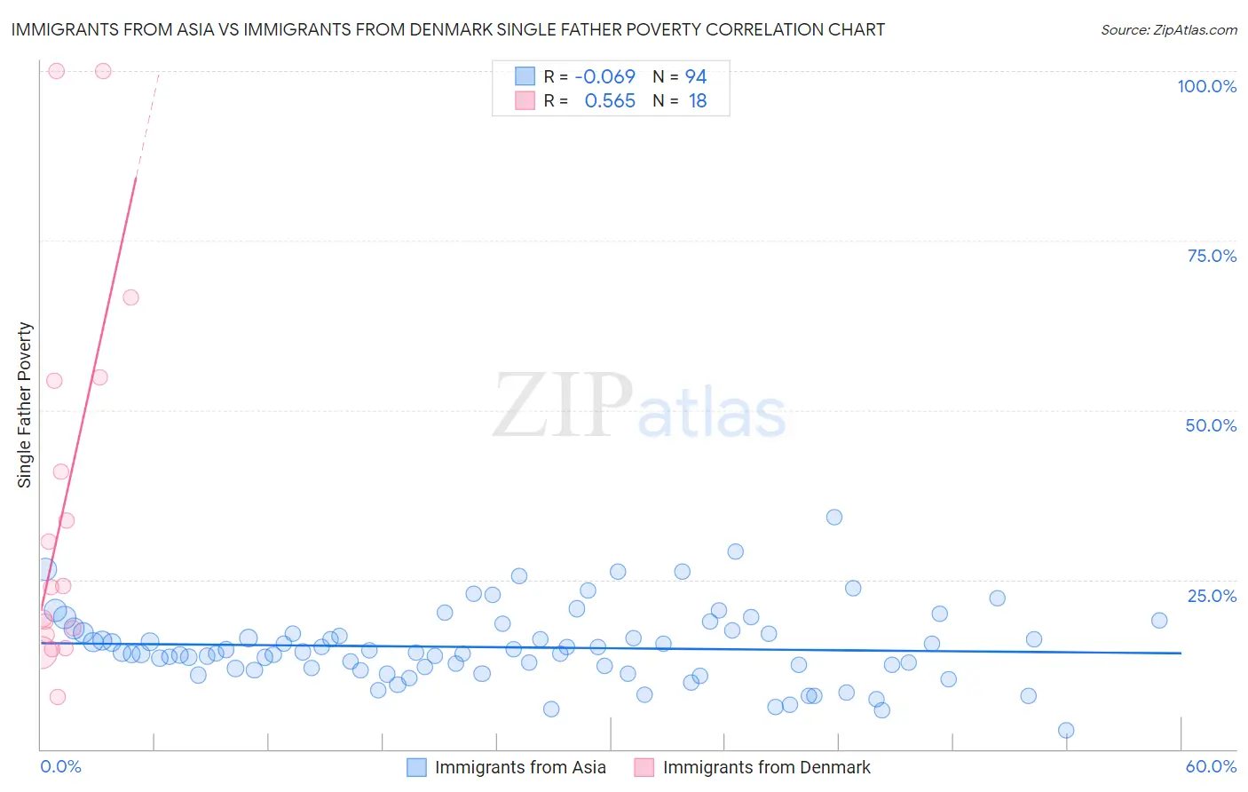 Immigrants from Asia vs Immigrants from Denmark Single Father Poverty Correlation Chart