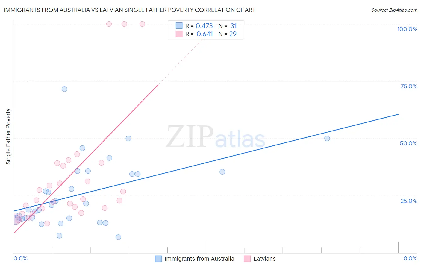 Immigrants from Australia vs Latvian Single Father Poverty Correlation Chart
