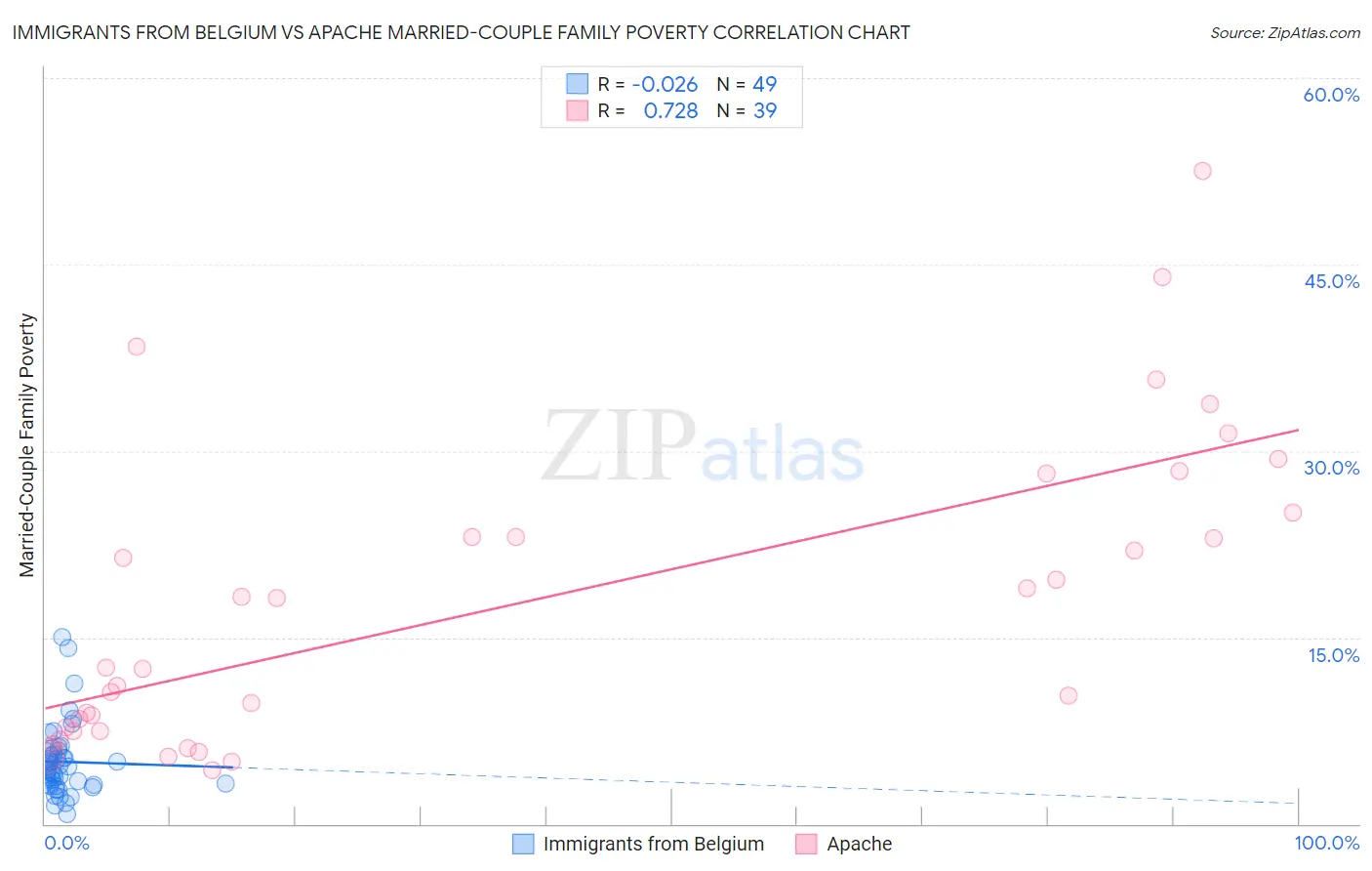 Immigrants from Belgium vs Apache Married-Couple Family Poverty Correlation Chart