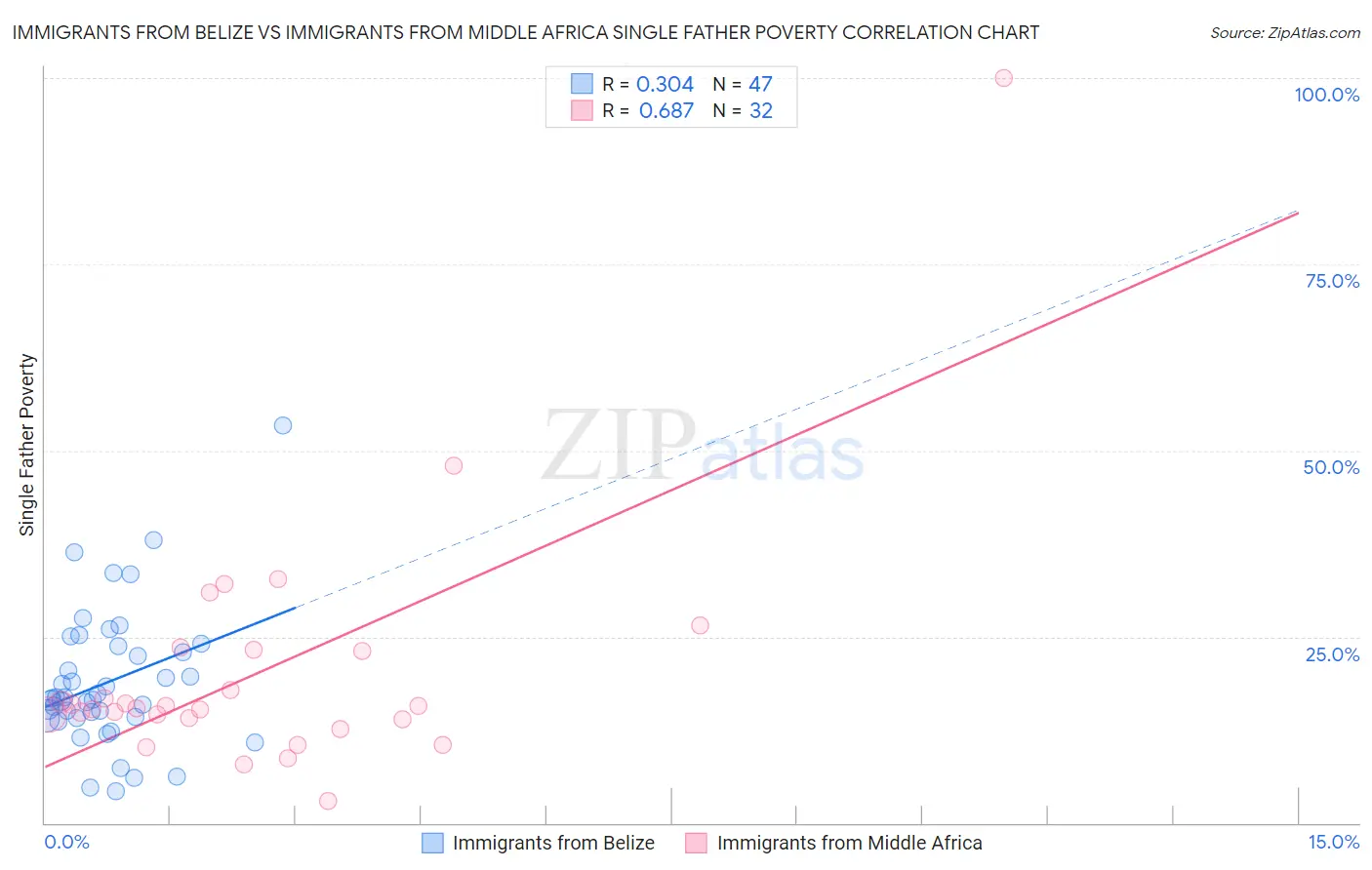 Immigrants from Belize vs Immigrants from Middle Africa Single Father Poverty Correlation Chart