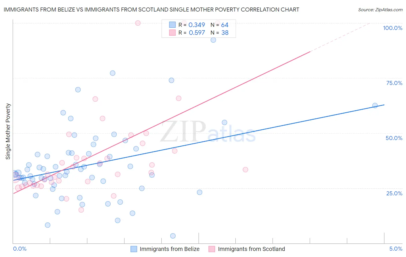 Immigrants from Belize vs Immigrants from Scotland Single Mother Poverty Correlation Chart