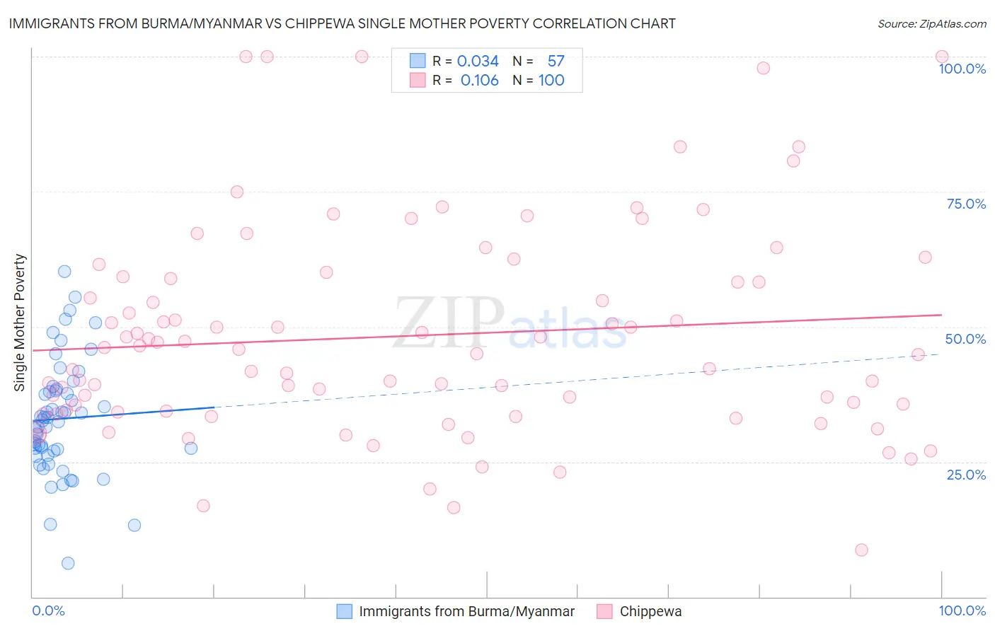 Immigrants from Burma/Myanmar vs Chippewa Single Mother Poverty Correlation Chart