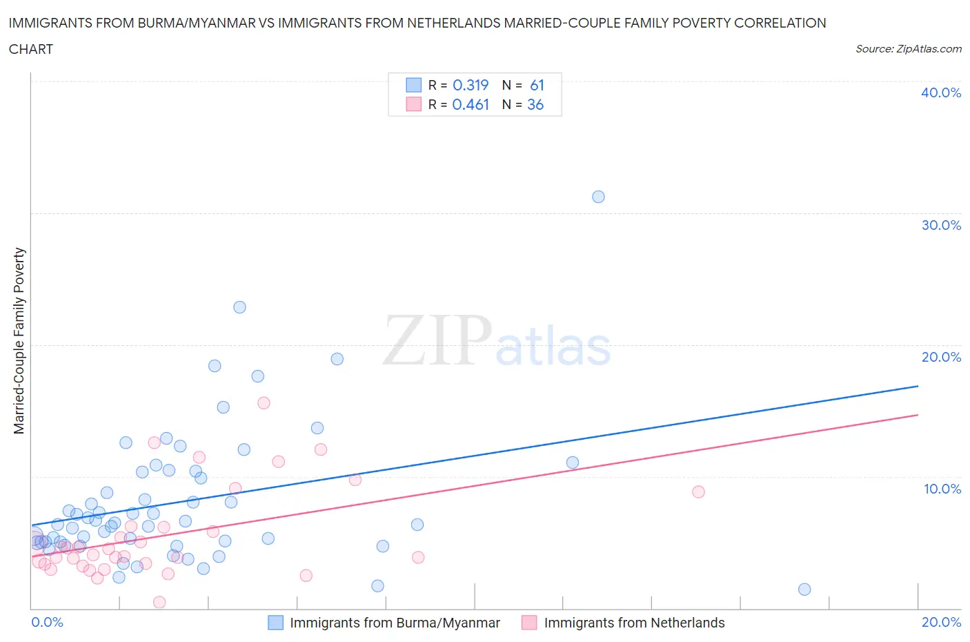 Immigrants from Burma/Myanmar vs Immigrants from Netherlands Married-Couple Family Poverty Correlation Chart