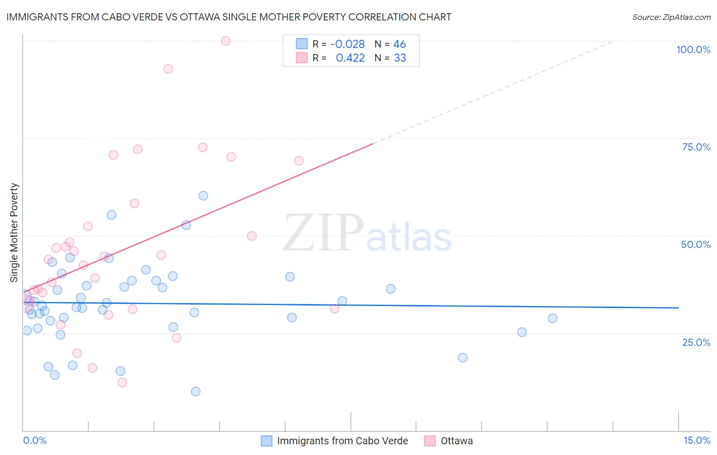 Immigrants from Cabo Verde vs Ottawa Single Mother Poverty Correlation Chart