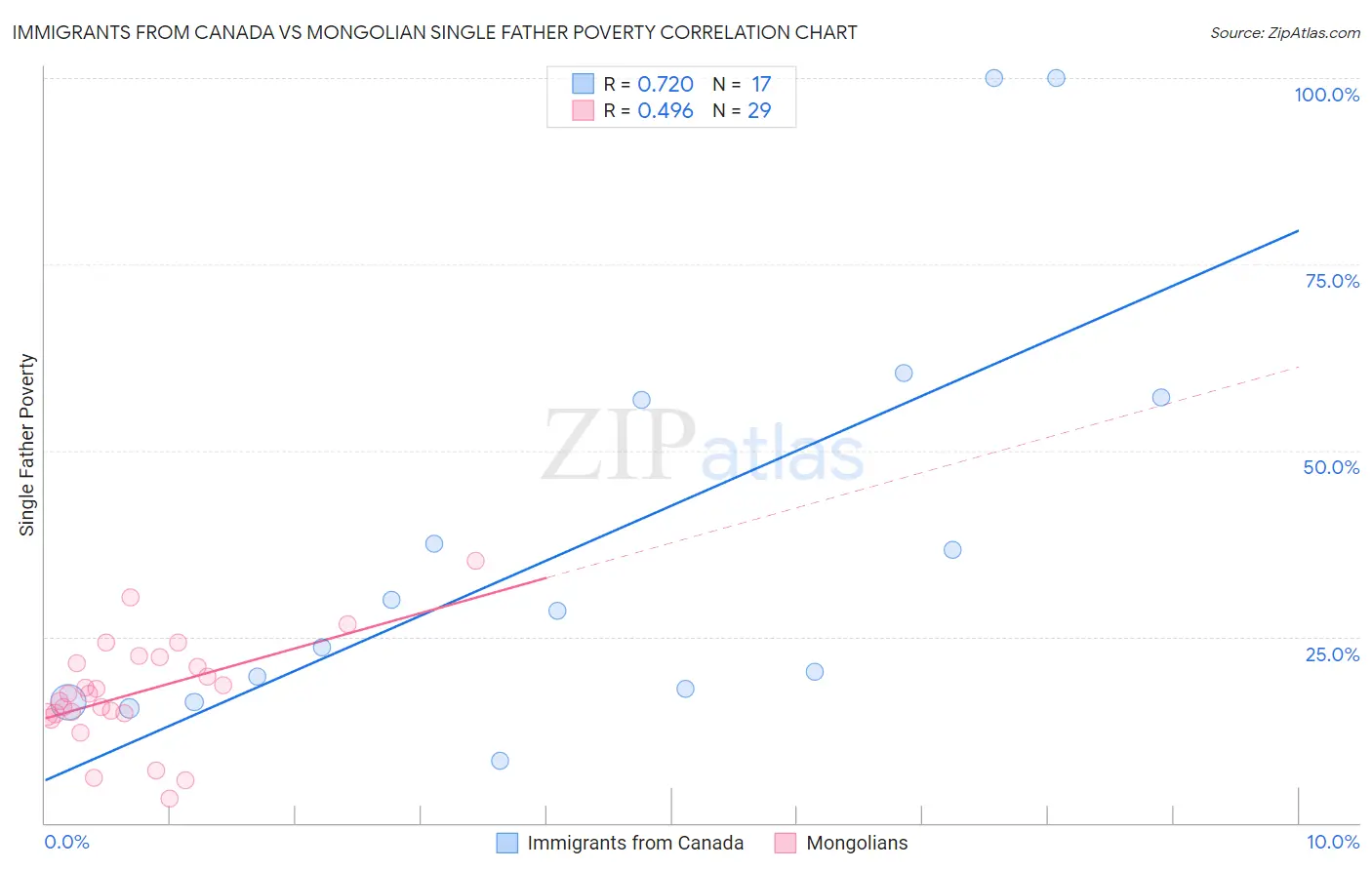 Immigrants from Canada vs Mongolian Single Father Poverty Correlation Chart