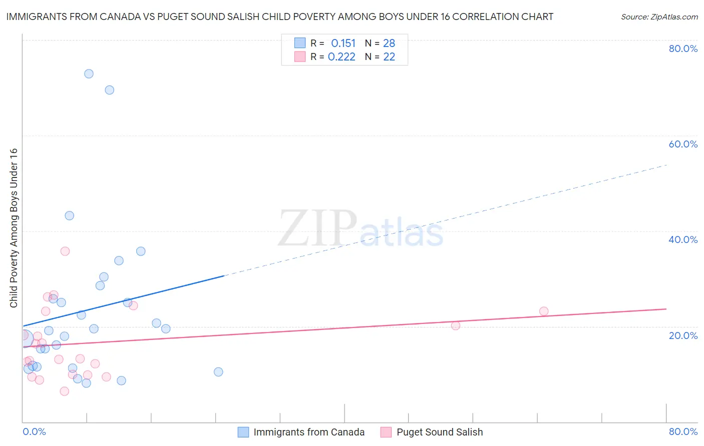 Immigrants from Canada vs Puget Sound Salish Child Poverty Among Boys Under 16 Correlation Chart