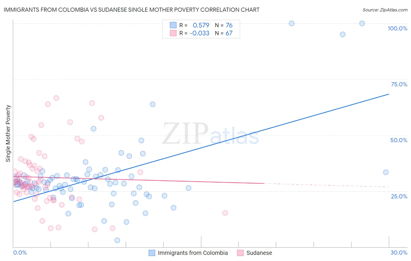 Immigrants from Colombia vs Sudanese Single Mother Poverty Correlation Chart