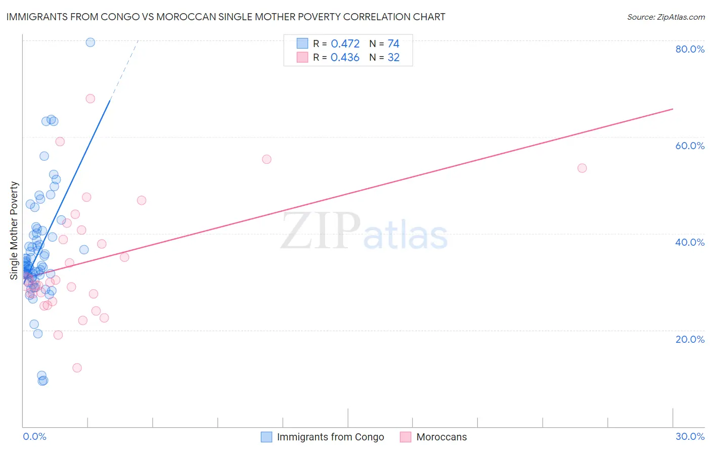 Immigrants from Congo vs Moroccan Single Mother Poverty Correlation Chart