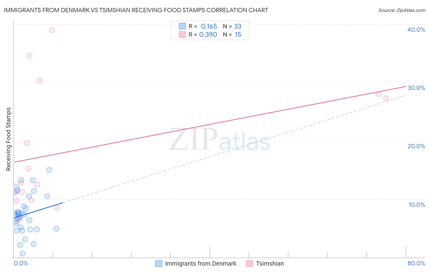 Immigrants from Denmark vs Tsimshian Receiving Food Stamps Correlation Chart