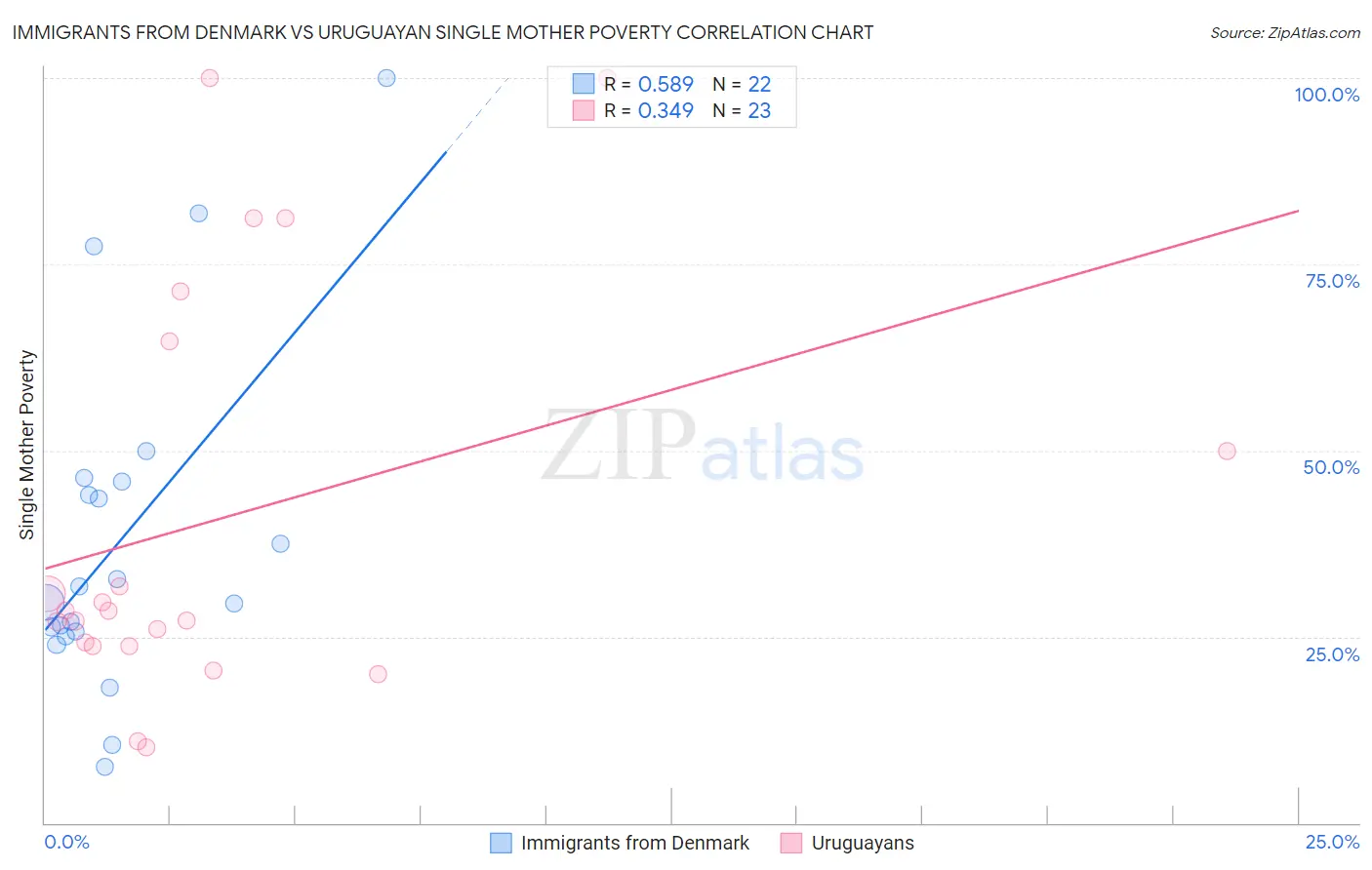 Immigrants from Denmark vs Uruguayan Single Mother Poverty Correlation Chart