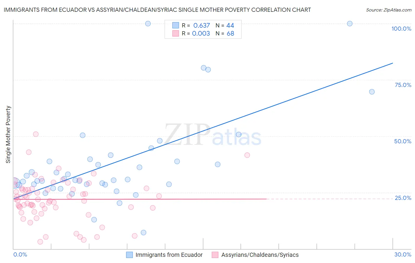 Immigrants from Ecuador vs Assyrian/Chaldean/Syriac Single Mother Poverty Correlation Chart