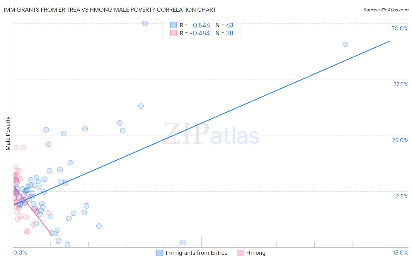 Immigrants from Eritrea vs Hmong Male Poverty Correlation Chart