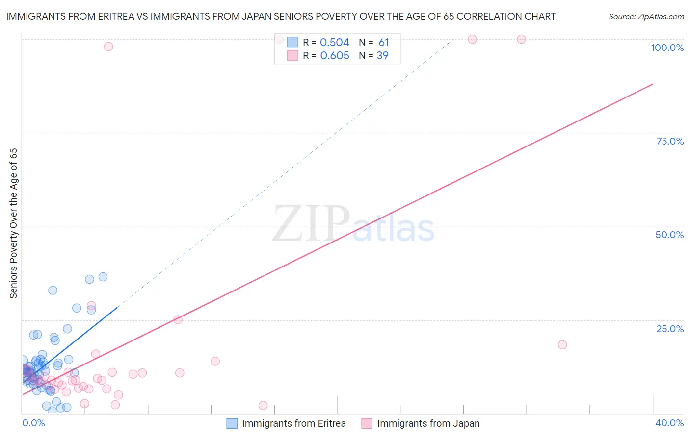 Immigrants from Eritrea vs Immigrants from Japan Seniors Poverty Over the Age of 65 Correlation Chart