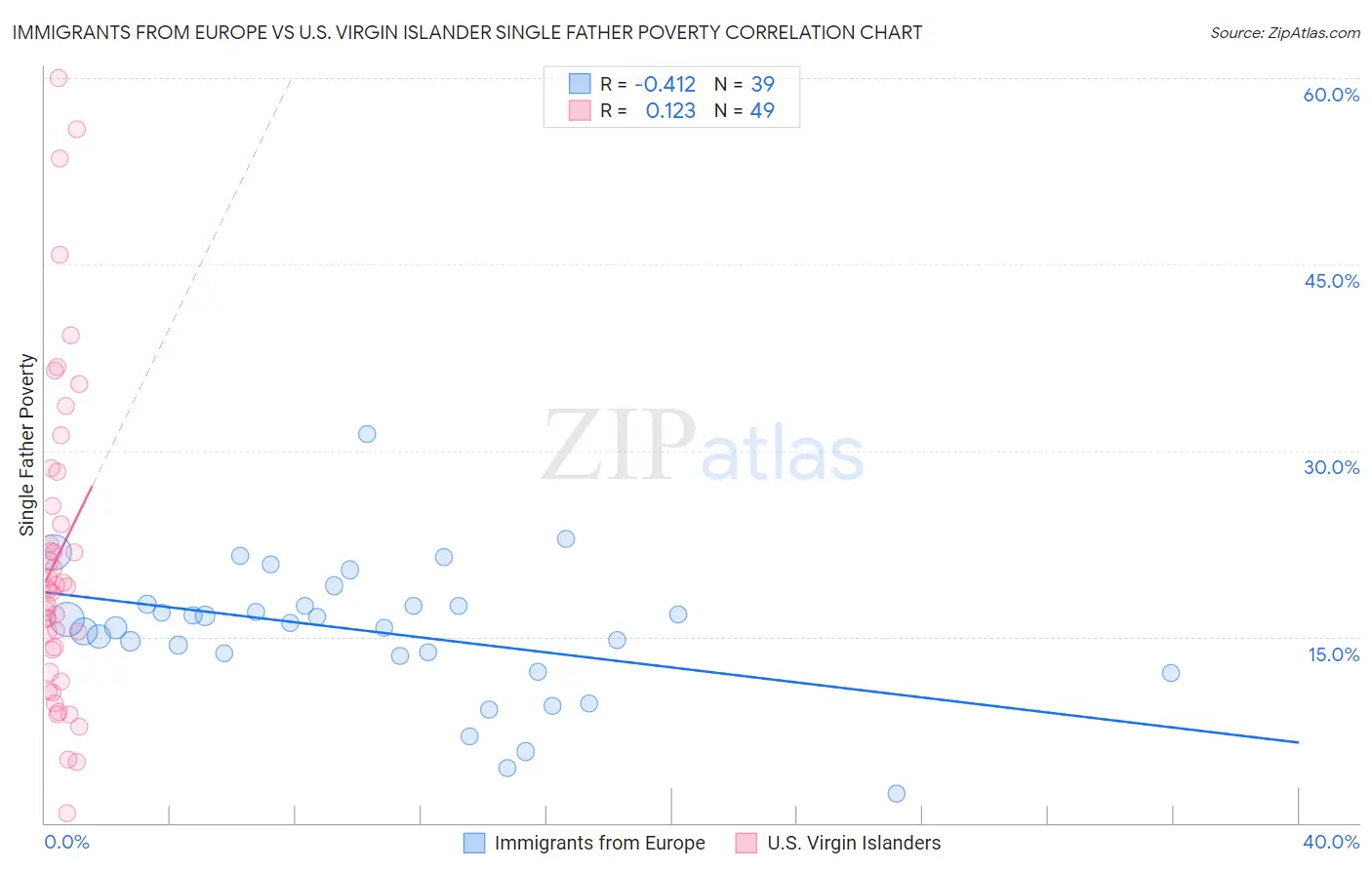 Immigrants from Europe vs U.S. Virgin Islander Single Father Poverty Correlation Chart