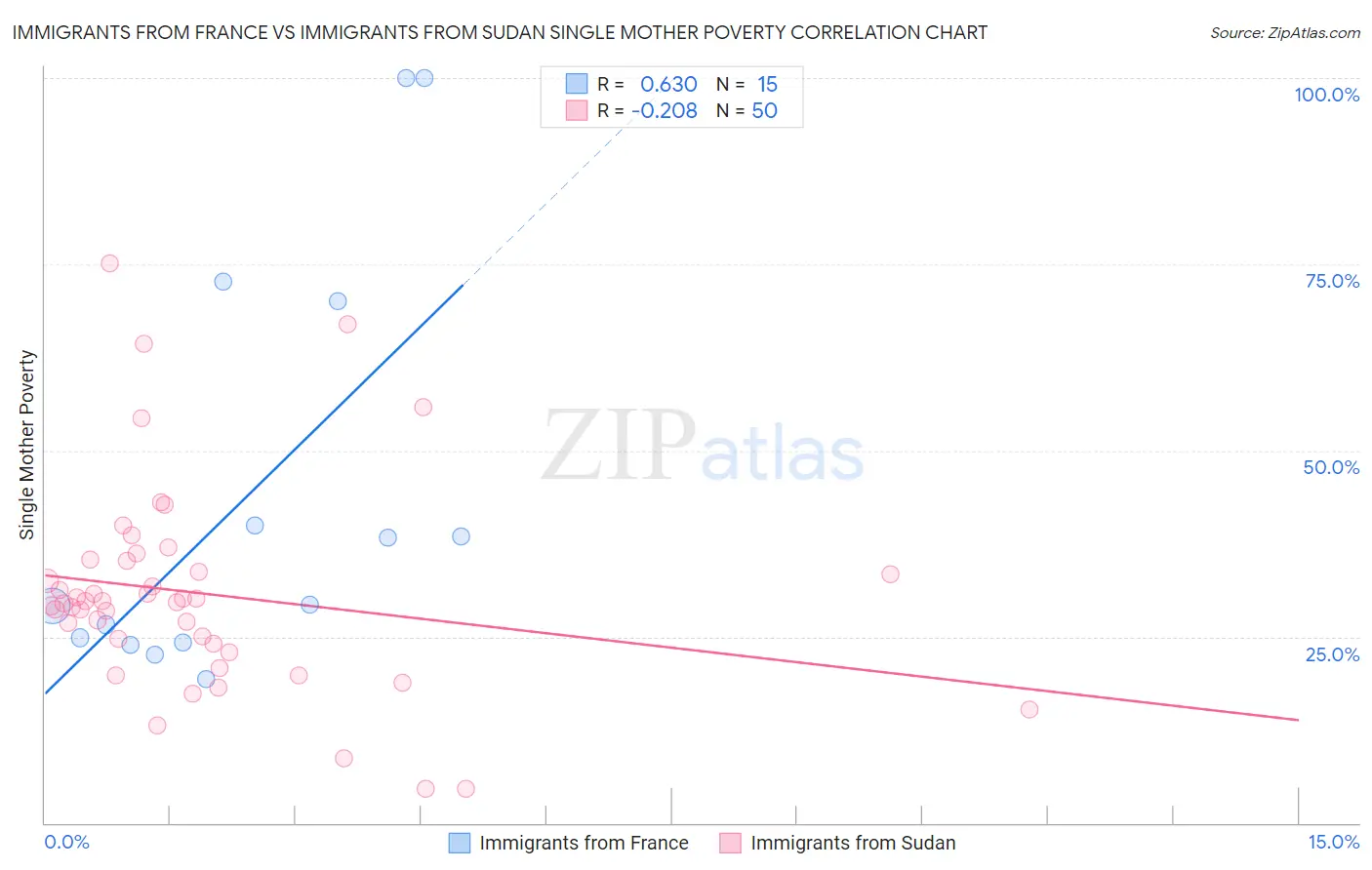 Immigrants from France vs Immigrants from Sudan Single Mother Poverty Correlation Chart