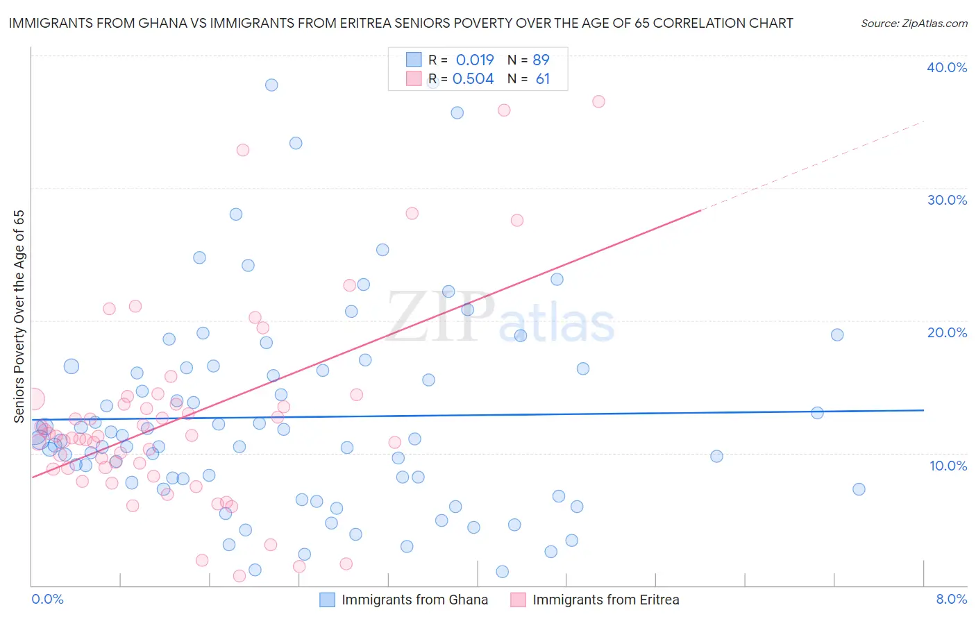 The statistical analysis conducted on geographies consisting of 199,289,505 people shows no correlation between the proportion of Immigrants from Ghana and poverty level among seniors over the age of 65 in the United States with a correlation coefficient (R) of 0.019 and weighted average of 12.8%. Similarly, the statistical analysis conducted on geographies consisting of 104,826,651 people shows a substantial positive correlation between the proportion of Immigrants from Eritrea and poverty level among seniors over the age of 65 in the United States with a correlation coefficient (R) of 0.504 and weighted average of 11.8%, a difference of 8.0%.