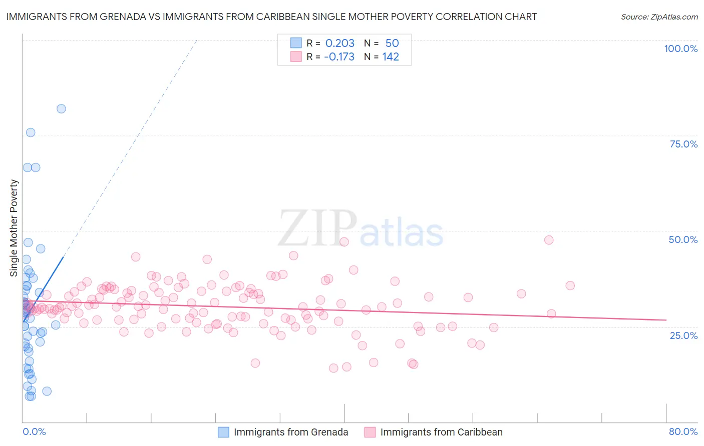 Immigrants from Grenada vs Immigrants from Caribbean Single Mother Poverty Correlation Chart